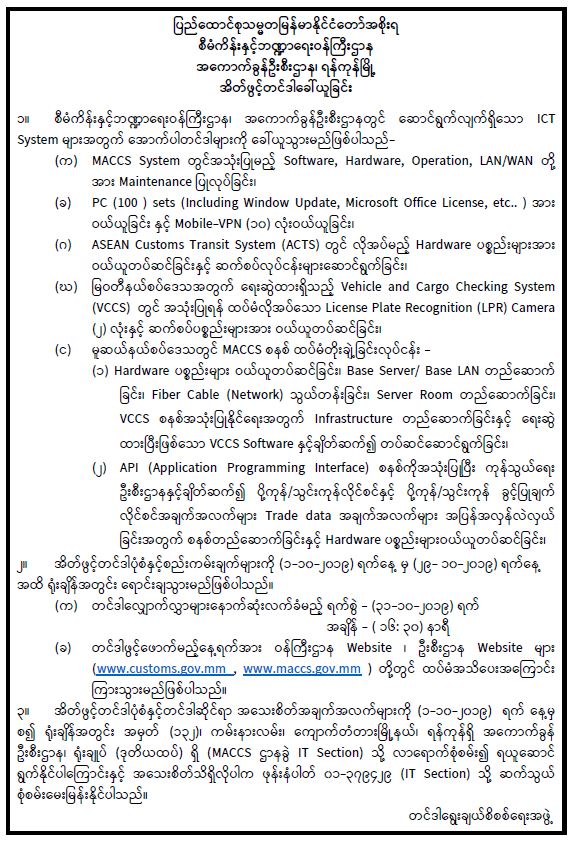 အကောက်ခွန်ဦးစီးဌာနတွင် ဆောင်ရွက်လျက်ရှိသော ICT System များအတွက် အိတ်ဖွင့်တင်ဒါခေါ်ယူခြင်း