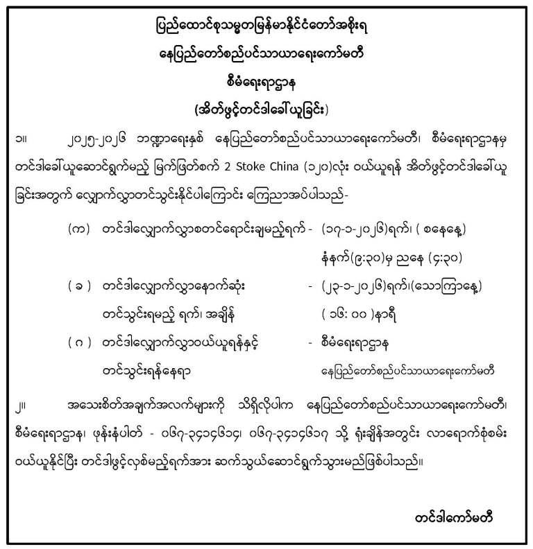 နေပြည်တော်စည်ပင်သာယာရေးကော်မတီ၊ စီမံရေးရာဌာနမှ အိတ်ဖွင့်တင်ဒါခေါ်ယူခြင်း
