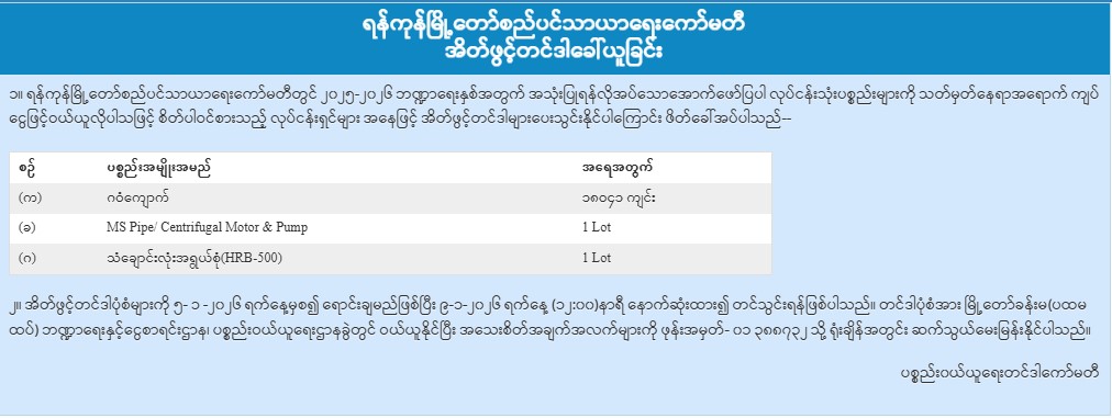 ရန်ကုန်မြို့တော်စည်ပင်သာယာရေးကော်မတီ အိတ်ဖွင့်တင်ဒါခေါ်ယူခြင်း