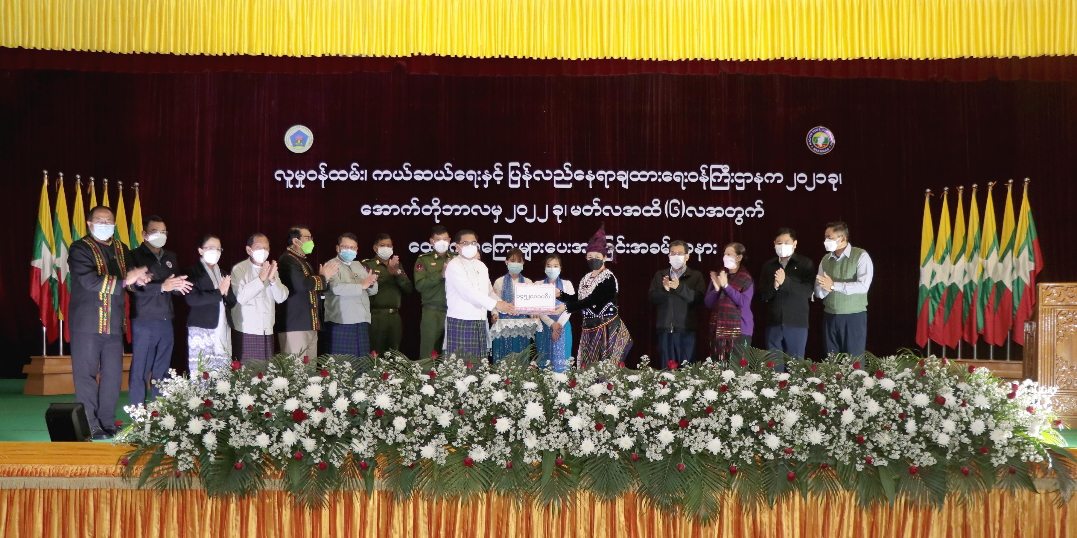 ၄။ အလားတူ ၂၀၂၁-၂၀၂၂ (၆)လ ဘတ်ဂျက်အတွက် ကချင်ပြည်နယ်အတွင်းရှိ အသက် (၈၅)နှစ် အထက် ဘိုးဘွားများအား လူမှုရေးပင်စင် ထောက်ပံ့ခြင်း၊ စေတနာ့ဝန်ထမ်း ပရဟိတဂေဟာများ၊ ကိုယ့်အားကိုယ်ကိုးမူလတန်းကြိုကျောင်းများအား ထောက်ပံ့ခြင်းနှင့် ယာယီခိုလှုံရာနေရာမှ ပြန်လည် ပြောင်းရွှေ့သည့် တိုက်ပွဲရှောင်ပြည်သူများ အတွက်ထောက်ပံ့ခြင်း အခမ်းအနားကို မနေ့က မနက်ပိုင်းတွင် မြစ်ကြီးနားမြို့၊ မြို့တော်ခန်းမ၌ ကိုဗစ်-၁၉ ရောဂါကာကွယ် ထိန်းချုပ်ရေး ဆိုင်ရာ စည်းကမ်းချက်များနှင့်အညီ ကျင်းပပြုလုပ်ခဲ့ရာ လူမှုဝန်ထမ်း၊ ကယ်ဆယ်ရေးနှင့် ပြန်လည်နေရာချထားရေးဝန်ကြီးဌာန၊ ပြည်ထောင်စုဝန်ကြီး ဒေါက်တာ သက်သက်ခိုင်၊ ပြည်နယ်အစိုးရအဖွဲ့ဝန်ကြီးချုပ် ဦးခက်ထိန်နန်၊ မြောက်ပိုင်းတိုင်း စစ်ဌာနချုပ်ဒုတိယ တိုင်းမှူး ဗိုလ်မှူးချုပ်အောင်မျိုးဦး၊ ပြည်နယ်အစိုးရအဖွဲ့ဝင်ဝန်ကြီးများ၊ လူမှုဝန် ထမ်းကယ်ဆယ်ရေးနှင့် ပြန်လည်နေရာချထားရေးဝန်ကြီးဌာန၊ အမြဲတမ်းအတွင်းဝန်၊ ညွှန်ကြားရေးမှူးချုပ်များ၊ ဌာနဆိုင်ရာ အကြီးအကဲများ၊ မြို့မိမြို့ဖများ၊ လူမှုရေးအဖွဲ့ အစည်းများမှကိုယ်စားလှယ်များနှင့် အကျိုးခံစားခွင့် ရှိသူပုဂ္ဂိုလ်များ Social Distancing ပုံစံဖြင့် တက်ရောက်ခဲ့ပါသည်။