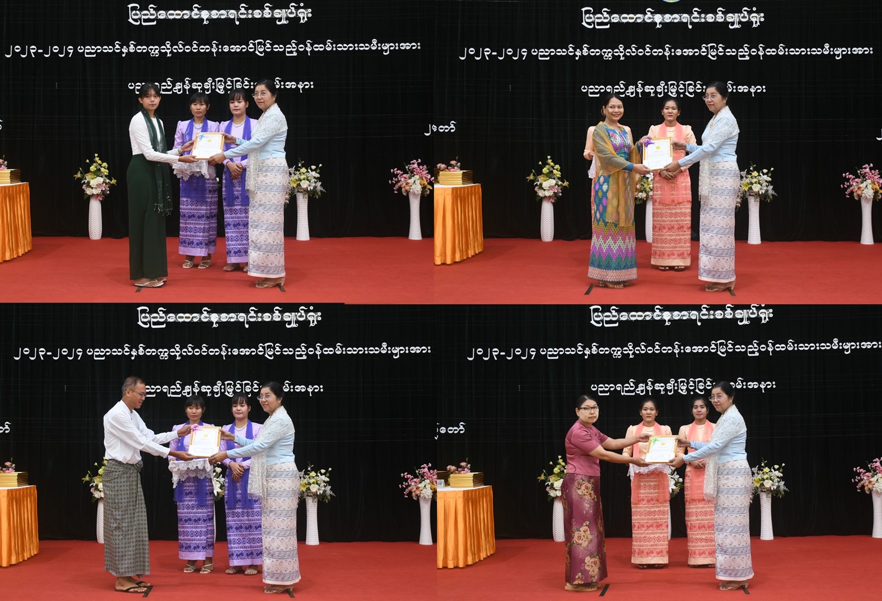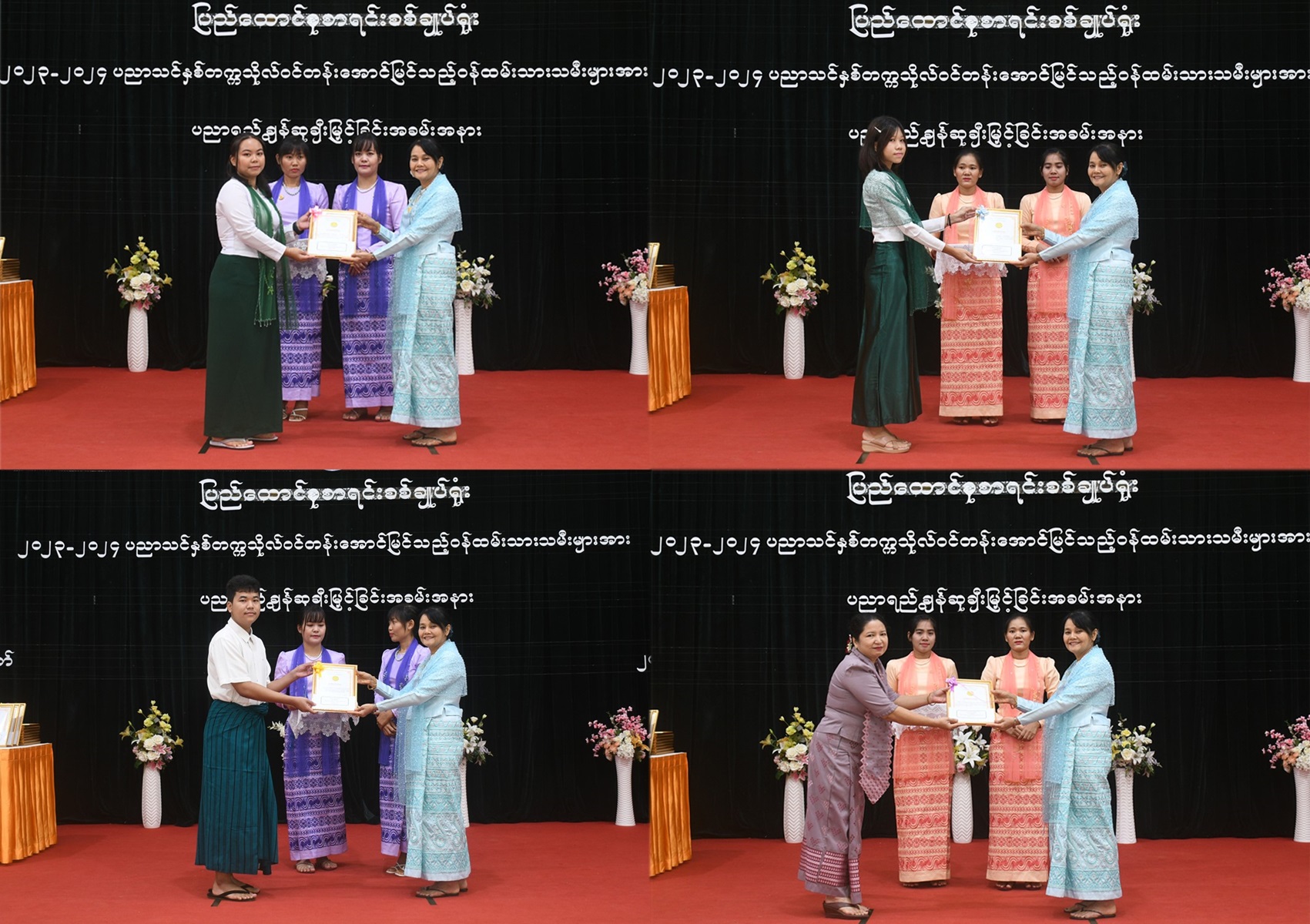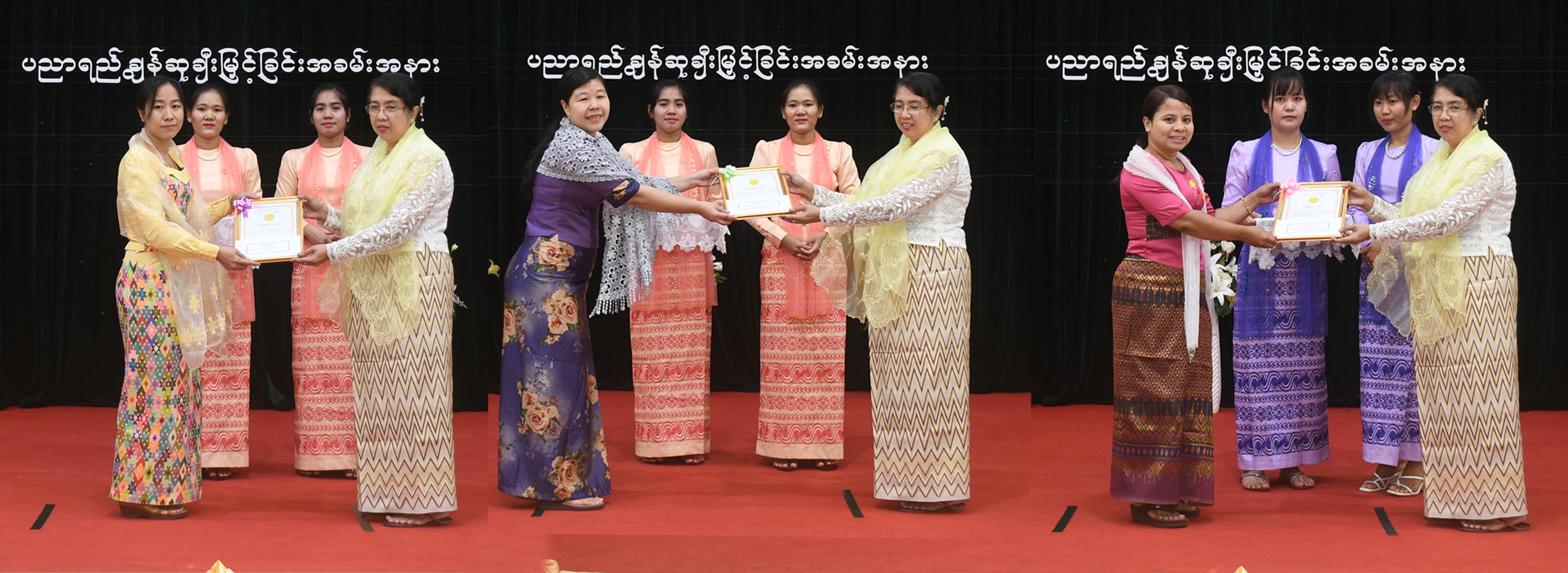 ဆက်လက်၍ ပြည်ထောင်စုစာရင်းစစ်ချုပ်၊ ဒုတိယစာရင်းစစ်ချုပ်၊ အမြဲတမ်းအတွင်းဝန် နှင့် ညွှန်ကြားရေးမှူးချုပ်များက ထူးချွန်ဝန်ထမ်းသားသမီးများဖြစ်သည့် ဘာသာစုံဂုဏ်ထူးရှင် (၁) ဦး၊ ငါးဘာသာဂုဏ်ထူးရှင် (၄) ဦး၊ လေးဘာသာဂုဏ်ထူးရှင် (၅) ဦး၊ သုံးဘာသာဂုဏ်ထူးရှင် (၄) ဦး ၊ နှစ်ဘာသာဂုဏ်ထူးရှင် (၄) ဦး ၊ တစ်ဘာသာဂုဏ်ထူးရှင် (၅) ဦး နှင့် ရိုးရိုးအောင်မြင်သူ (၃၂) ဦးတို့အား ဂုဏ်ပြုဆုငွေနှင့် ဂုဏ်ပြုမှတ်တမ်းလွှာများ ပေးအပ်ချီးမြှင့်ရာ တက်ရောက် လာသည့် ကျောင်းသား ကျောင်းသူများနှင့် Online မှ တက်ရောက်သည့် ကျောင်းသား ကျောင်းသူများ ကိုယ်စားမိဘများနှင့် သက်ဆိုင်ရာတာဝန်ရှိ သူများက လက်ခံခဲ့ကြသည်။
