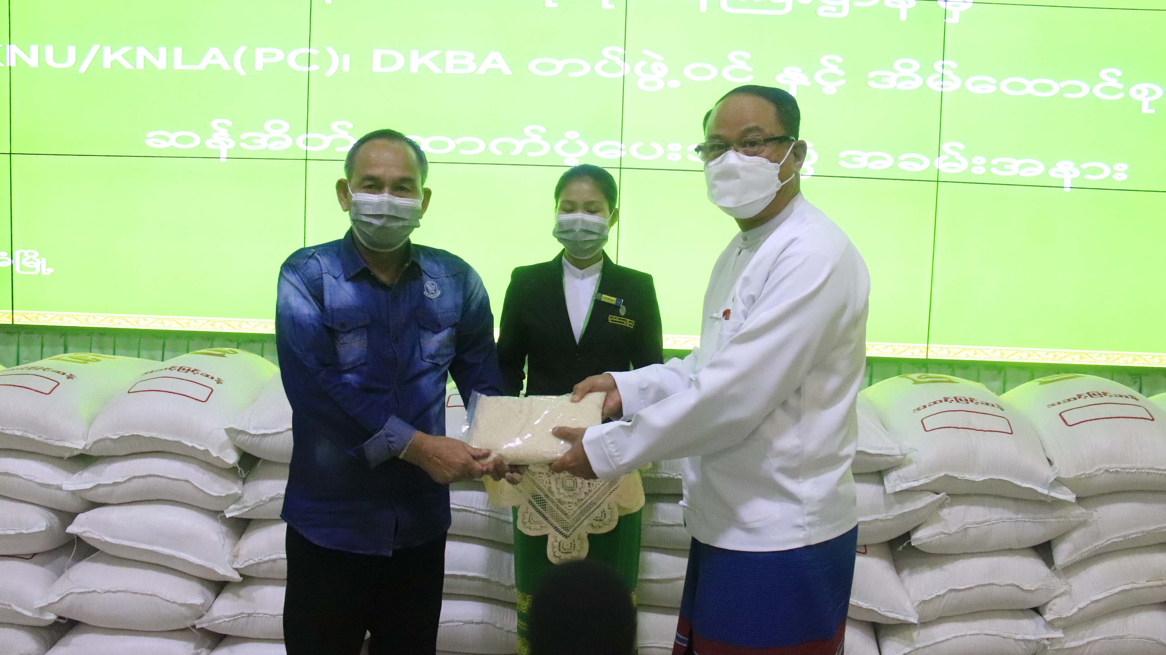 ထို့နောက် ပြည်နယ်ဝန်ကြီးချုပ်က KNU/KNLA(PC)၊ DKBA တပ်ဖွဲ့ဝင်နှင့် အိမ်ထောင်စုများသို့ ဆန်အိတ် ၃၀၀ အိတ်စီ ထောက်ပံ့ပေးအပ်ရာ ဒီမိုကရေစီအကျိုးပြုကရင်တပ်မတော် DKBA စစ်ဦးစီးချုပ် စောစတီးနှင့် ကရင်အမျိုးသားအစည်းအရုံး/ကရင်လွတ်မြောက်ရေးတပ်မတော်-ငြိမ်းချမ်းရေးကောင်စီ KNU/KNLA(PC) ဒုတိယ ဥက္ကဋ္ဌ ဒေါက်တာနော်ကပေါ်ထူးတို့က လက်ခံရယူပြီး ဒို့တာဝန်အရေးသုံးပါးကိုဦးထိပ်ထား၍ ငြိမ်းချမ်းရေးဆိုင်ရာနှင့် ဒေသဖွံ့ဖြိုးရေး ဆိုင်ရာများကို အကောင်းဆုံးကြိုးစားဆောင်ရွက်သွားမည်ဖြစ်ကြောင်း ကျေးဇူးတင်စကားများ ပြန်လည်ပြောကြားကာ ပြည်နယ်ဝန်ကြီးချုပ်က နိဂုံးချုပ်အမှာစကားပြောကြားသည်။