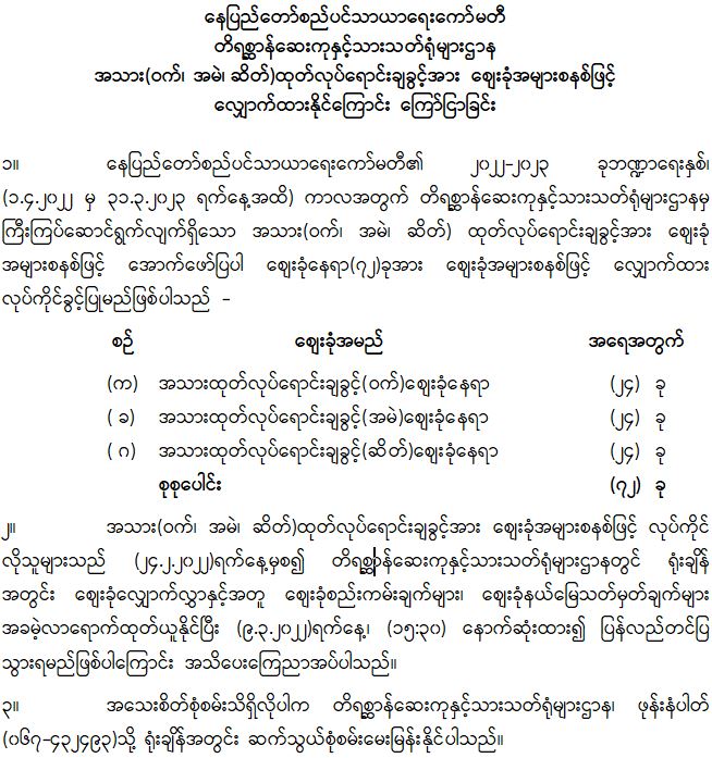 နေပြည်တော်စည်ပင်သာယာရေးကော်မတီ၊ စျေးခုံအများစနစ်ဖြင့် လျှောက်ထားနိုင်ကြောင်း ကြော်ငြာခြင်း