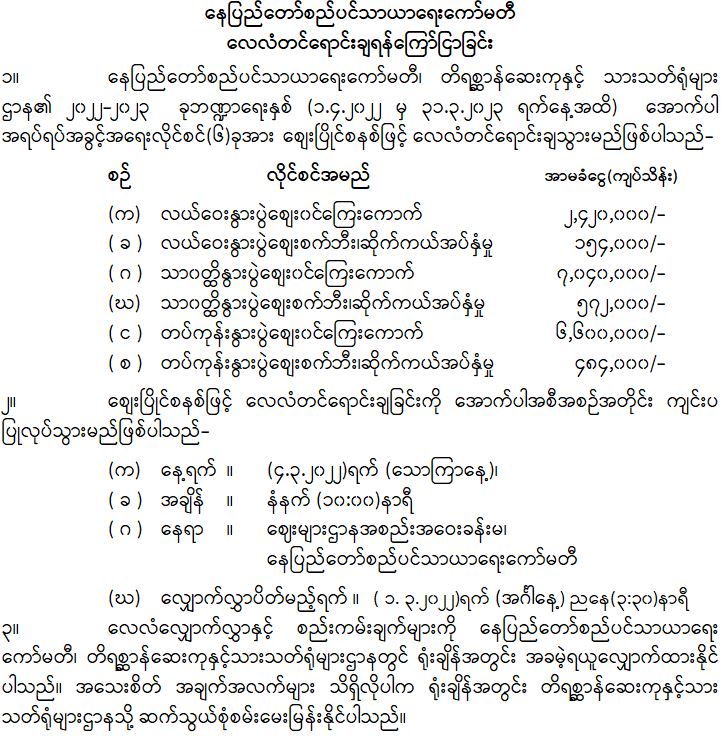 နေပြည်တော်စည်ပင်သာယာရေးကော်မတီ၊ လေလံတင်ရောင်းချရန်ကြော်ငြာခြင်း