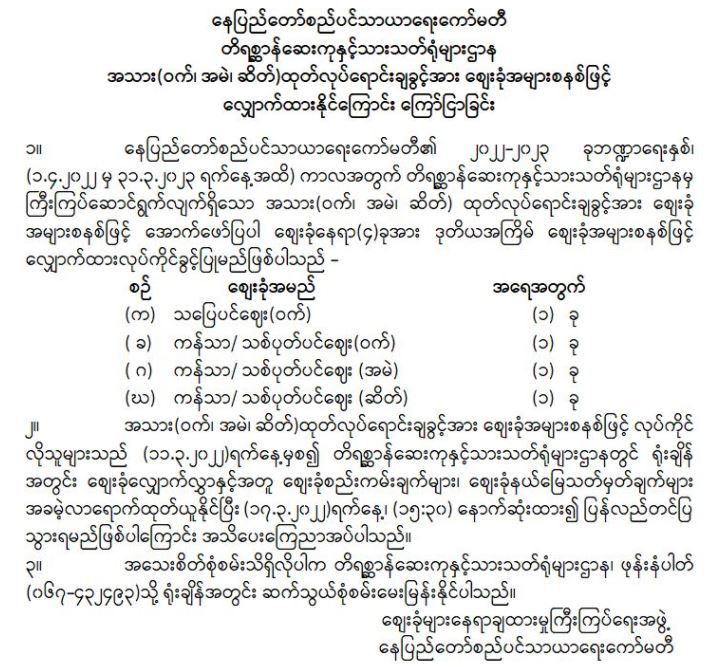 နေပြည်တော်စည်ပင်သာယာရေးကော်မတီ၊ တိရစ္ဆာန်ဆေးကုနှင့်သားသတ်ရုံများဌာန မှ အသားထုတ်လုပ်ရောင်းချခွင့်အား ဈေးခုံအများစနစ်ဖြင့် လျှောက်ထားနိုင်ကြောင်း ကြော်ငြာခြင်း