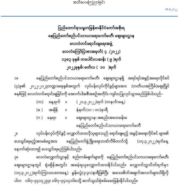 နေပြည်တော်စည်ပင်သာယာရေးကော်မတီ၊ ဈေးများဌာနမှ အရပ်ရပ်အခွင့်အရေးလိုင်စင်(၄)ခု၏ လုပ်ငန်းလုပ်ကိုင်ခွင့်များအား (တတိယအကြိမ်)ဈေးပြိုင်စနစ်ဖြင့် လေလံတင်ရောင်းချခြင်း