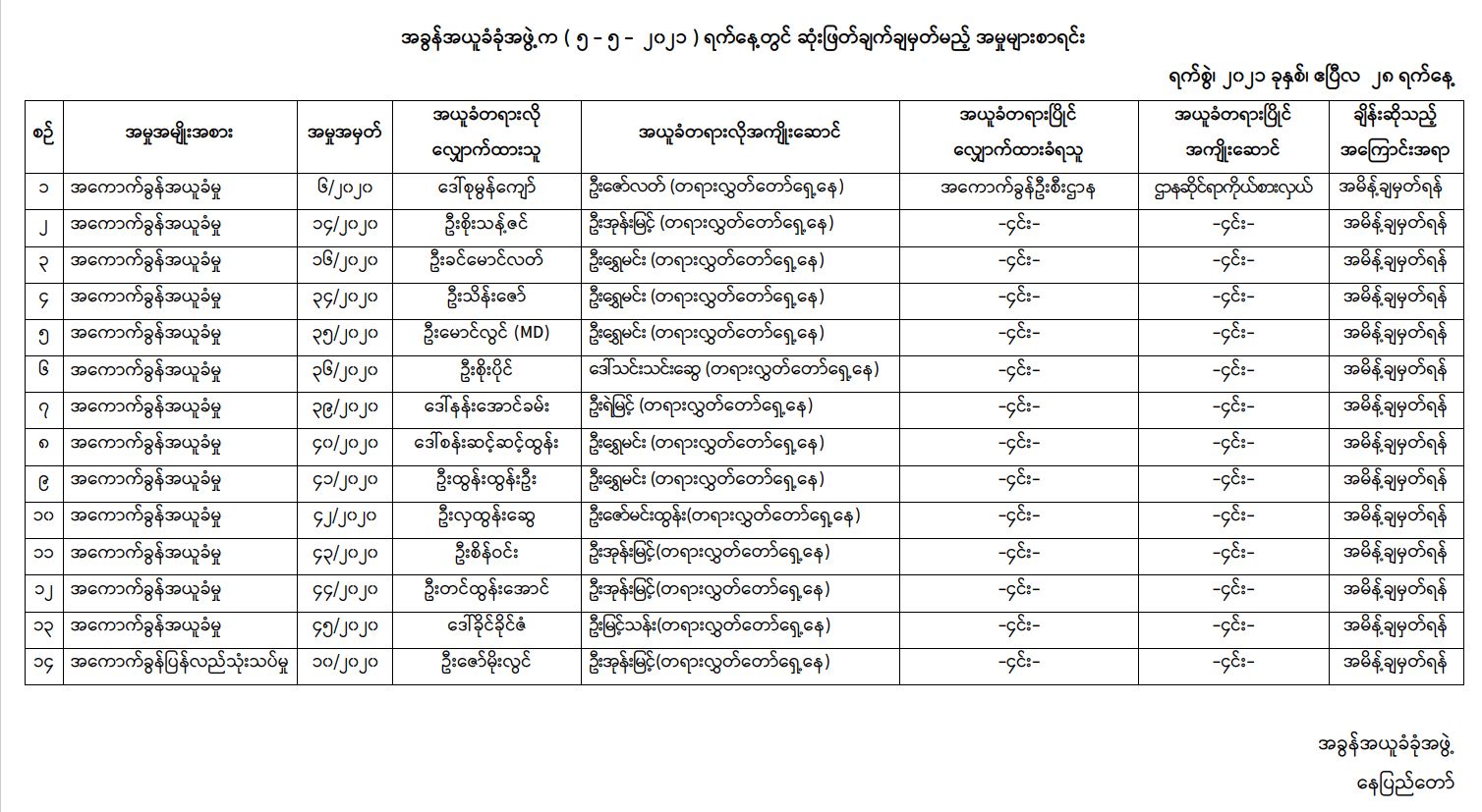 အခွန်အယူခံခုံအဖွဲ့က ၅ - ၅ - ၂၀၂၁ ရက်နေ့တွင် ဆုံးဖြတ်ချက်ချမှတ်မည့် အမှုများစာရင်း