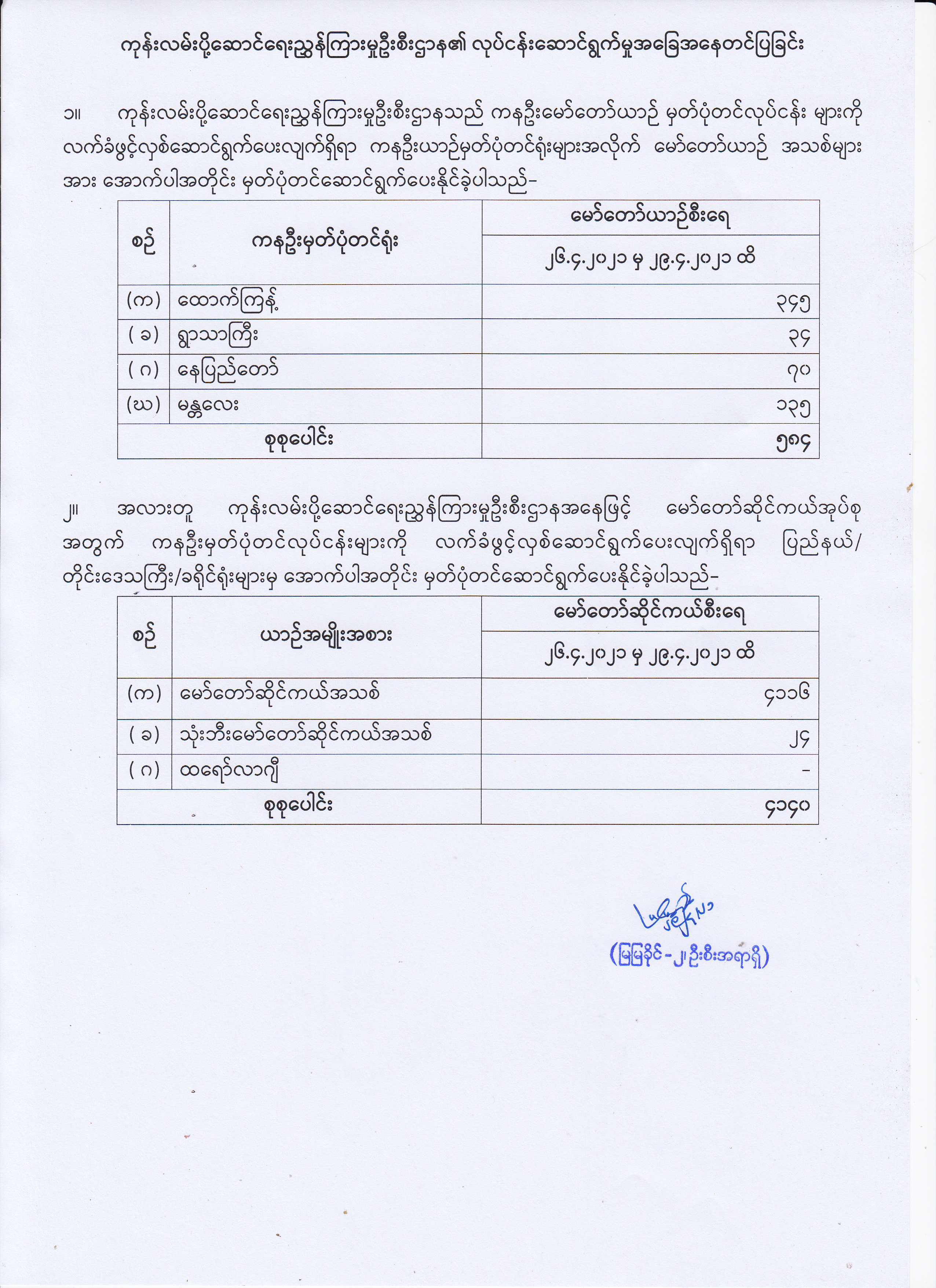 ၂၆.၄.၂၀၂၁ မှ ၂၉.၄.၂၀၂၁ ရက်ထိ ကနဉီးမှတ်ပုံတင်လုပ်ငန်း