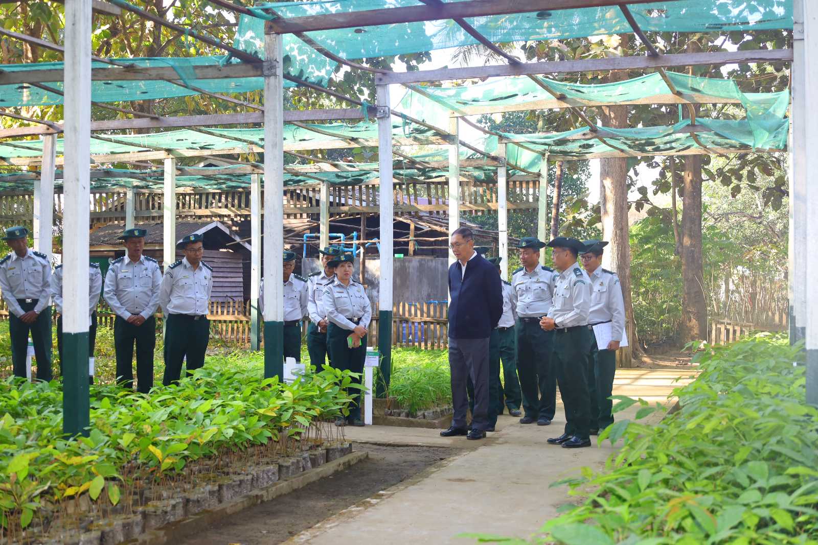 သယံဇာတနှင့်သဘာဝပတ်ဝန်းကျင်ထိန်းသိမ်းရေးဝန်ကြီးဌာန၊ ပြည်ထောင်စုဝန်ကြီး ဦးခင်မောင်ရီသည် တာဝန်ရှိသူများလိုက်ပါလျက် ၉-၁-၂၀၂၆ ရက်နေ့နံနက်ပိုင်းတွင် နေပြည်တော်၊ ဥတ္တရခရိုင်၊ ဥတ္တရသီရိမြို့နယ်ရှိ သစ်တောသုတေသနစခန်းအမှတ် ၅၊ မိုးစွေသို့ သွားရောက်၍ တောတွင်း လက်တွေ့ကွင်းဆင်း ဆောင်ရွက်နေသည့် မြန်မာနိုင်ငံသစ်တောကျောင်း၊ အမှတ်စဉ် ၁၁၉ မှ သင်တန်းသားများအား တွေ့ဆုံသည်။