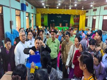 မကွေးတိုင်းဒေသကြီး၊ ချောက်မြို့နယ် အထွေထွေအုပ်ချုပ်ရေးဦးစီးဌာန၌ မဲရုံမှူးနှင့် ဒုတိယမဲရုံမှူး များအား မြန်မာအီလက်ထရောနစ်မဲပေးစက် (MEVM) ကြိုတင်စမ်းသပ်စစ်ဆေးခြင်းနှင့် လက်တွေ့ သရုပ်ပြမဲပေးခြင်း အခမ်းအနား ကျင်းပ