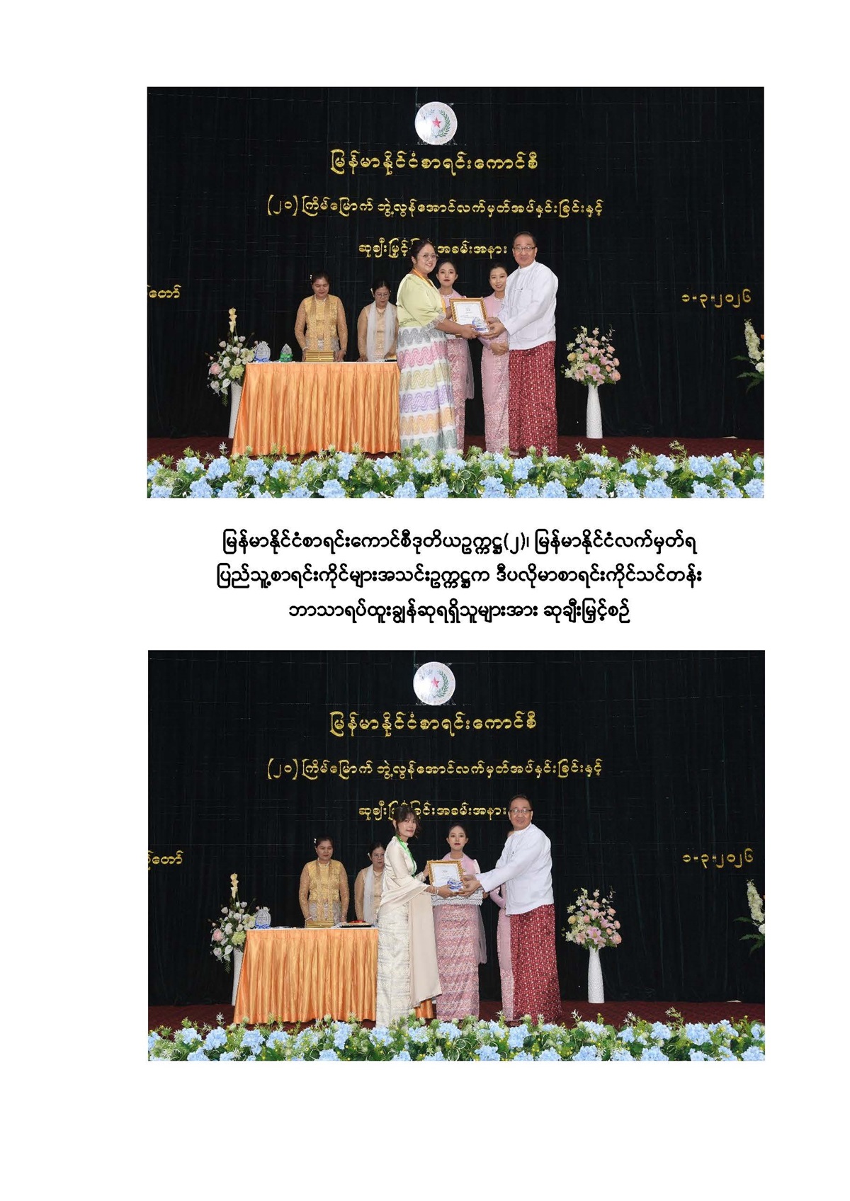 မြန်မာနိုင်ငံစာရင်းကောင်စီက ကြီးမှူးကျင်းပသည့် (၂၀) ကြိမ်မြောက် လက်မှတ်ရ ပြည်သူ့စာရင်းကိုင်နှင့် စာရင်းကိုင်ပညာဒီပလိုမာ အောင်လက်မှတ်အပ်နှင်းခြင်းနှင့် ဆုချီးမြှင့် ခြင်းအခမ်းအနားကို ၂၀၂၆ ခုနှစ် မတ်လ ၁ ရက်နေ့ နံနက် ၉ : ၀၀ နာရီတွင် လည်းကောင်း၊ ပထမအကြိမ် နိုင်ငံပိုင်ကဏ္ဍအတွက် နိုင်ငံတကာစာရင်းစံများ၊ နိုင်ငံတကာဘဏ္ဍာရေး အစီရင်ခံခြင်းစံများ ဘွဲ့လွန်ဒီပလိုမာလက်မှတ်ပေးအပ်ခြင်းနှင့်ဆုချီးမြှင့်ခြင်း အခမ်းအနားကို မွန်းလွဲ ၂:၀၀ နာရီတွင်လည်းကောင်း နေပြည်တော်ရှိ ပြည်ထောင်စုစာရင်းစစ်ချုပ်ရုံး၊ နဝရတ် ခန်းမ၌ ကျင်းပခဲ့သည်။