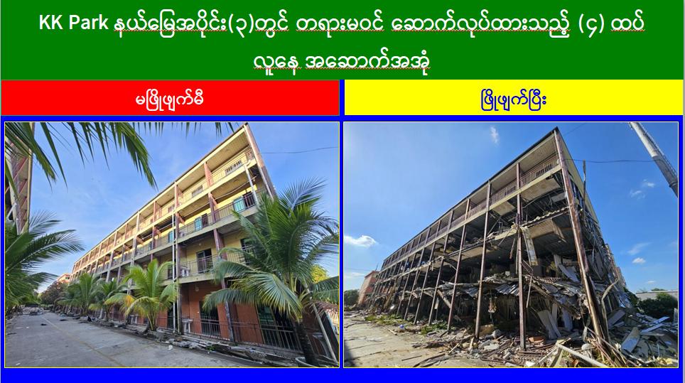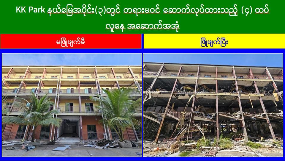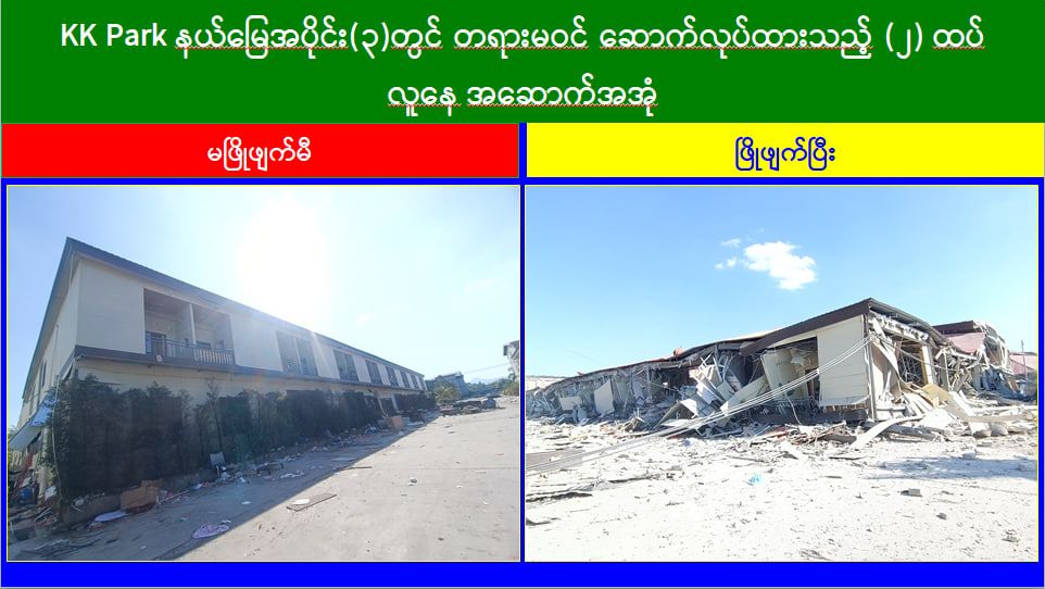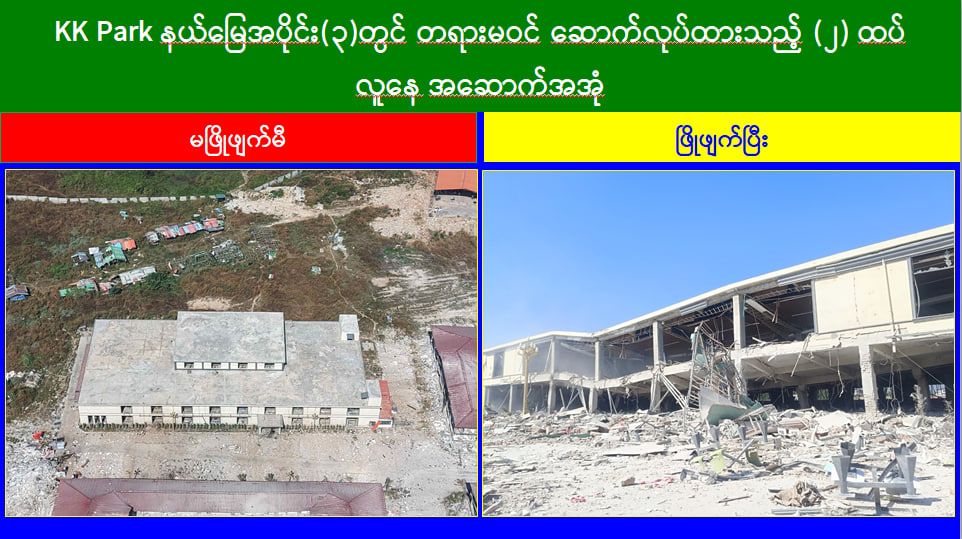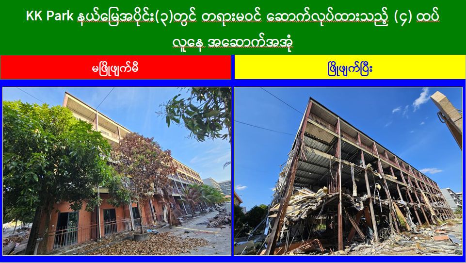 ယနေ့တွင် မြဝတီ-မဲထော်သလေး (KK Park) အပိုင်း(၃)နယ်မြေအတွင်းရှိ အွန်လိုင်းလိမ်လည်လောင်းကစားမှုများ ကျူးလွန်ရာတွင် အသုံးပြုခဲ့သည့် တရားမဝင် ၄ ထပ်အဆောက်အအုံ ၃ လုံး၊ ၂ ထပ်အဆောက်အအုံ ၂ လုံး စုစုပေါင်း တရားမဝင်အဆောက်အအုံ ၅ လုံးတို့ကို ထပ်မံဖြိုချဖျက်ဆီးခဲ့သဖြင့် KK Park နယ်မြေအတွင်းရှိတရားမဝင် အဆောက်အအုံ စုစုပေါင်း ၆၃၅ လုံး အနက် ၅၀၉ လုံးကို စနစ်တကျဖြိုချဖျက်ဆီးပြီးဖြစ်ကြောင်း သိရှိရသည်။