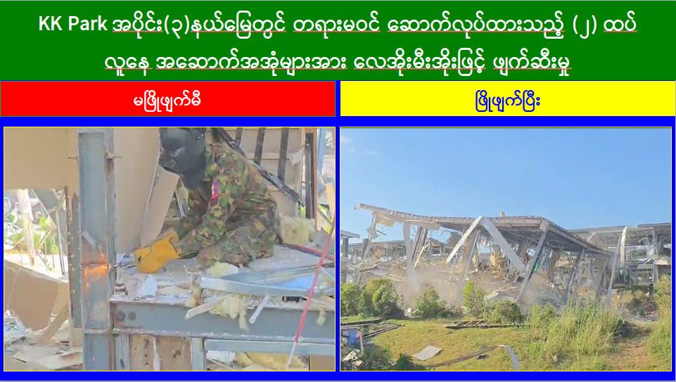 မြန်မာနိုင်ငံအစိုးရအနေဖြင့် အွန်လိုင်းလိမ်လည်လောင်းကစားမှုများ အများဆုံးအခြေချလုပ်ကိုင်လျက်ရှိကြသည့် ရွှေကုက္ကိုလ်နယ်မြေနှင့် KK Park နယ်မြေများရှိ တရားမဝင်အဆောက်အအုံများအတွင်း ဝင်ရောက်ရှင်းလင်းခြင်း၊ အွန်လိုင်းလိမ်လည်လောင်းကစားမှုလုပ်ငန်းစဉ်များတွင် အသုံးပြုခဲ့သည့် သိမ်းဆည်းရမိပစ္စည်းများနှင့် တရားမဝင်အဆောက်အအုံများအား စနစ်တကျဖြိုချဖျက်ဆီးခြင်းများကို လုံခြုံရေးတပ်ဖွဲ့ဝင်များ၊ အုပ်ချုပ်ရေးအဖွဲ့အစည်းများနှင့် ဒေသတွင်းတာဝန်ရှိသူများအပါအဝင် အဖွဲ့စုံပါဝင်သည့် ပူးပေါင်းအဖွဲ့ဖြင့် ဆောင်ရွက်လျက်ရှိရာ ယနေ့တွင် KK Park နယ်မြေအတွင်းရှိ တရားမဝင်အဆောက်အအုံ ၅ လုံးကို ထပ်မံဖြိုချဖျက်ဆီးခဲ့ကြောင်း သိရှိရသည်။