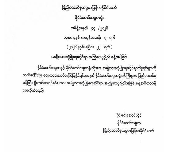 ရန်ကုန်မြို့နှင့် မန္တလေးမြို့အတွက် ရည်ညွှန်းလက်ကားဈေးနှုန်းများနှင့် ပြည်ထောင်စုနယ်မြေ နေပြည်တော်၊ တိုင်းဒေသကြီး/ပြည်နယ် မြို့တော်များအတွက် ရည်ညွှန်းလက်လီဈေးနှုန်းများ