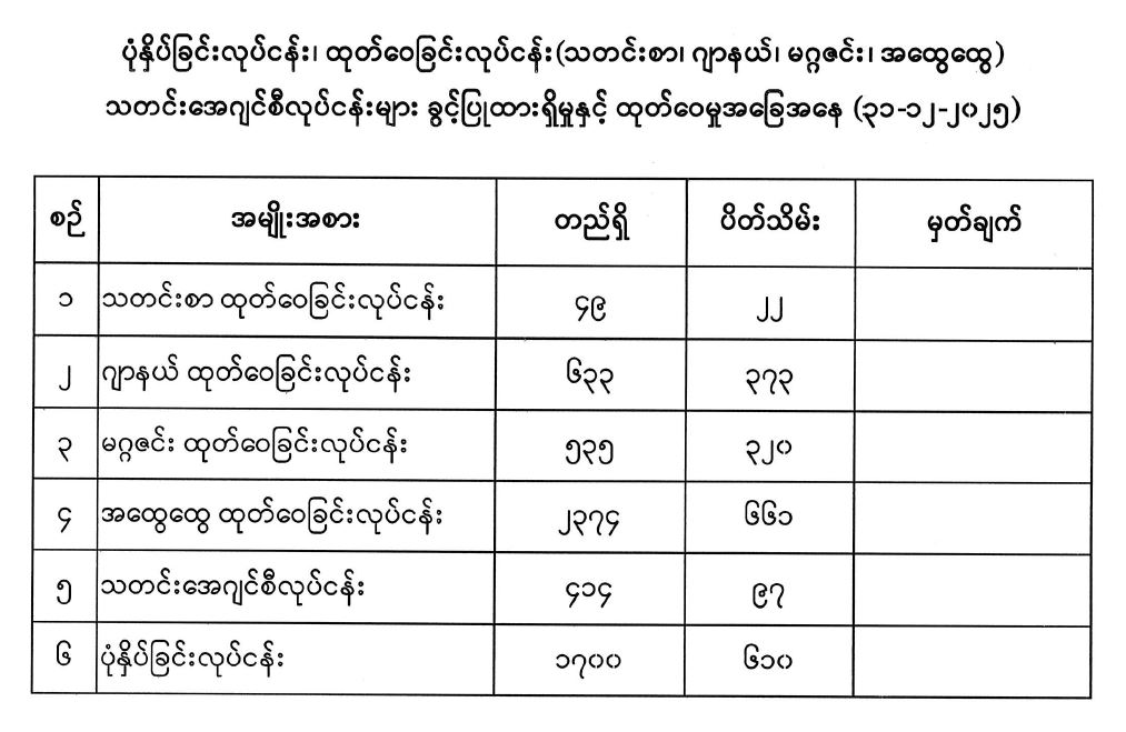 ပုံနှိပ်ခြင်းလုပ်ငန်း၊ ထုတ်ဝေခြင်းလုပ်ငန်း(သတင်းစာ၊ ဂျာနယ်၊ မဂ္ဂဇင်း၊ အထွေထွေ) သတင်းအေဂျင်စီလုပ်ငန်းများ ခွင့်ပြုထားရှိမှုနှင့် ထုတ်ဝေမှုအခြေအနေ (၃၁-၁၂-၂၀၂၅)