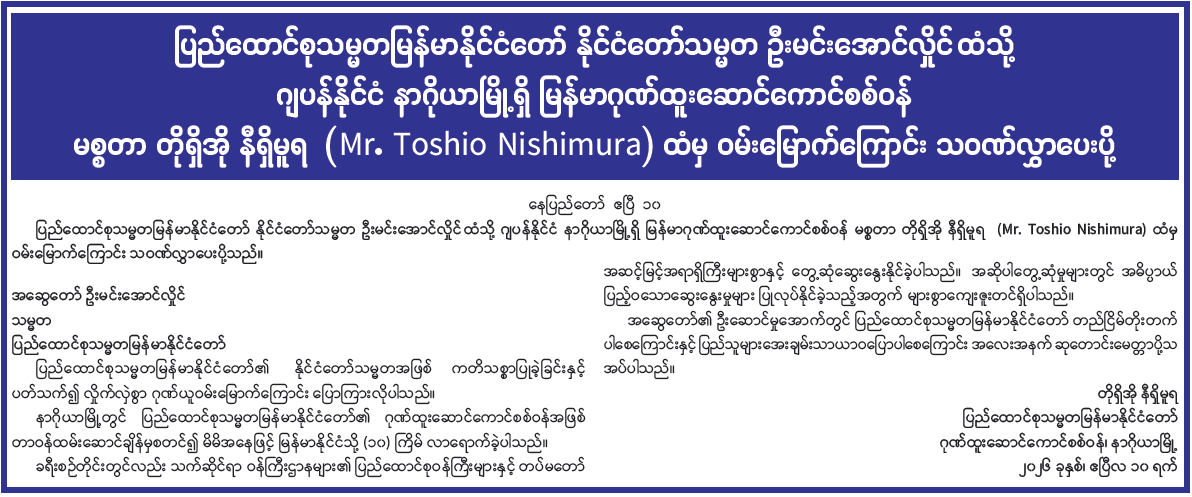 ပြည်ထောင်စုသမ္မတမြန်မာနိုင်ငံတော် နိုင်ငံတော်သမ္မတ ဦးမင်းအောင်လှိုင် ထံသို့ ဂျပန်နိုင်ငံ နာဂိုယာမြို့ရှိ မြန်မာဂုဏ်ထူးဆောင်ကောင်စစ်ဝန် မစ္စတာ တိုရှိအို နီရှိမူရ (Mr. Toshio Nishimura) ထံမှ ဝမ်းမြောက်ကြောင်း သဝဏ်လွှာပေးပို့