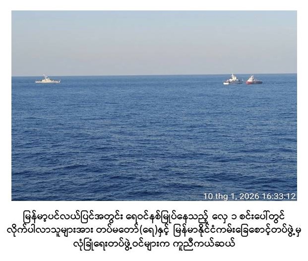 ရန်ကုန်တိုင်းဒေသကြီး၊ ရန်ကုန်မြို့၏ တောင်ဘက်ရေမိုင် ၁၅၆ မိုင်ခန့်အကွာရှိ မြန်မာ့ပင်လယ်ပြင်အတွင်း ရေဝင်နစ်မြုပ်နေသည့် လှေတစ်စင်းပေါ်မှ လိုက်ပါလာသူများအား တပ်မတော် (ရေ) နှင့် မြန်မာနိုင်ငံကမ်းခြေစောင့်တပ်ဖွဲ့မှ လုံခြုံရေးတပ်ဖွဲ့ဝင်များက ကူညီကယ်ဆယ်ရေးလုပ်ငန်းများ ဆောင်ရွက်ပေးခဲ့ကြောင်း သိရှိရသည်။