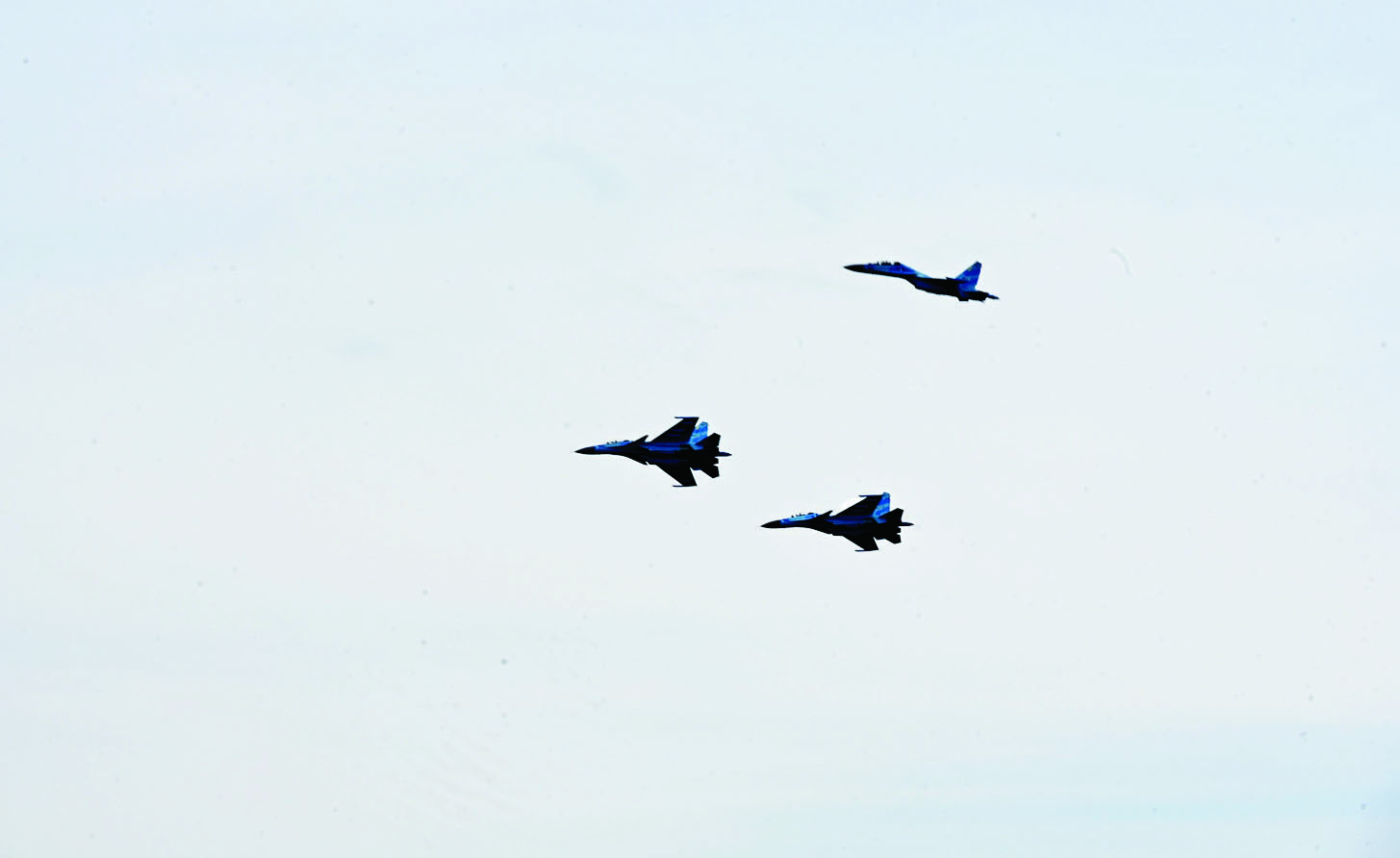 ယင်းနောက် MiG-29 ဘက်စုံသုံး ဂျက်တိုက်လေယာဉ် ငါးစင်းက ရှုရပ်၏ ရှေ့တည့်တည့်မှ ပျံသန်းဝင်ရောက်ပြီး Fan Brake ပုံစံဖြင့် ပျံသန်းသရုပ်ပြသည်။