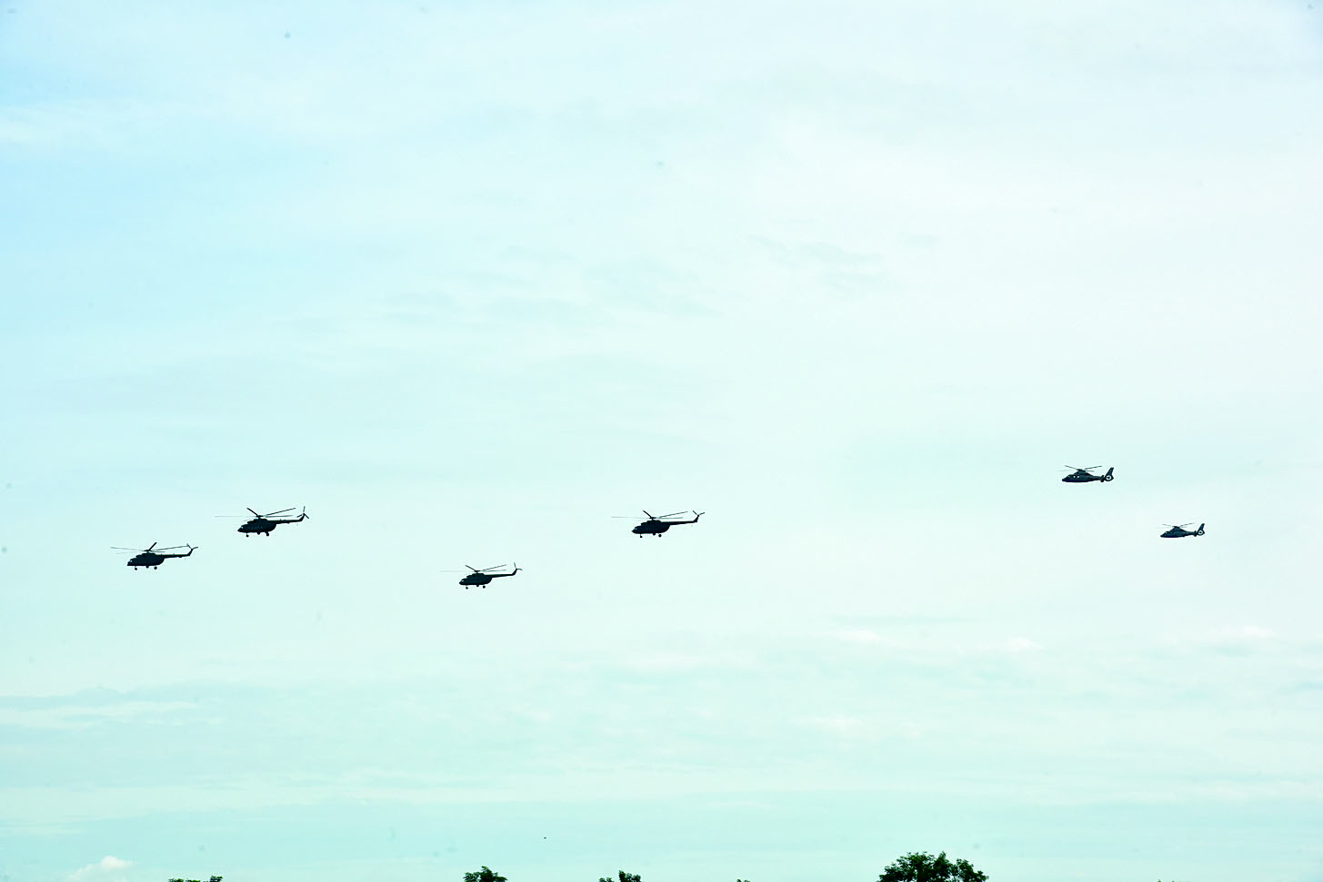 ထို့နောက် လေယာဉ်၊ ရဟတ်ယာဉ်များ သရုပ်ပြအုပ်ဖွဲ့ပျံသန်းအလေးပြုခြင်းနှင့် စွမ်းရည်ပြသခြင်းများကို ဆောင်ရွက်ရာ Mi-17 ရဟတ်ယာဉ် လေးစင်း၊ Eurocopter ရဟတ်ယာဉ် နှစ်စင်း တို့က Composite Formation ပုံစံဖြင့်လည်းကောင်း ၊ Bell – 206 ရဟတ်ယာဉ် နှစ်စင်း၊ H-125 ရဟတ်ယာဉ် နှစ်စင်းတို့က Composite Box Formation ပုံစံဖြင့်လည်းကောင်း၊ MTX-1B ကင်းထောက်လေယာဉ် တစ်စင်း၊ MTX-A ကင်းထောက်လေယာဉ်တစ်စင်းနှင့် Grob-120 TP အမောင်းသင်လေယာဉ် တစ်စင်းတို့က Trail Formation ပုံစံဖြင့်လည်းကောင်း၊ ATR-72 သယ်ယူ ပို့ဆောင်ရေးလေယာဉ် တစ်စင်း၊ Beech-1900D သယ်ယူပို့ဆောင် ရေးလေယာဉ် နှစ်စင်းတို့က Composite Arrow Head Formation ပုံစံဖြင့်လည်းကောင်း၊ K-8 ဂျက်တိုက်လေယာဉ် လေးစင်း တို့က Box Formation ပုံစံဖြင့်လည်းကောင်း၊ MiG-29 ဘက်စုံသုံး ဂျက်တိုက်လေယာဉ် ငါးစင်းက Arrow Head Formation ပုံစံဖြင့်လည်းကောင်း၊ Su-30 SME ဘက်စုံသုံး အကြီးစားဂျက်တိုက် လေယာဉ် သုံးစင်းက Arrow Head Formation ပုံစံဖြင့်လည်းကောင်း အသီးသီးသရုပ်ပြပျံသန်း ကြသည်။