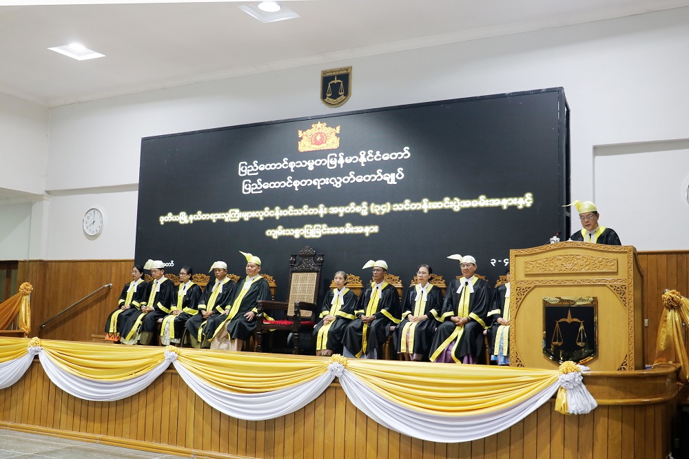 And then, under section 23 Sub-Section (c) (i) of the Union Judiciary Law, in accordance with the provision provided that the Supreme Court of the Union is to arrange for any new judges to take an oath or affirmation at the time of assigning duty, the recruited judicial officers took an oath in the presence of the Union Chief Justice and the Justices of the Supreme Court of the Union “we ourselves by declaring solemnly and sincerely that we will be upholding and abiding by the Constitution of the Union and the existing laws; and will be adjudicating the cases fairly and rightly in accordance with law by following the Code of Judicial Conduct and by abstaining from four kinds of prejudices while carrying out our judicial functions”.