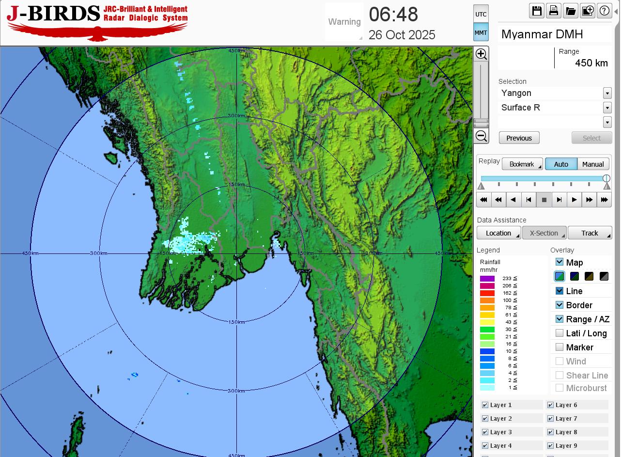 ဘင်္ဂလားပင်လယ်အော်အခြေအနေ။ ယနေ့မြန်မာစံတော်ချိန် ၀၅:၃၀ နာရီအချိန် တိုင်းထွာချက်များအရ ဘင်္ဂလားပင်လယ်အော် အရှေ့တောင်ပိုင်းတွင် ဖြစ်ပေါ်နေသော မုန်တိုင်းငယ် (Depression) သည် ဆက်လက်တည်ရှိနေပါသည်။ အဆိုပါ မုန်တိုင်းငယ် သည် မြန်မာနိုင်ငံ၊ ကိုကိုးကျွန်းမြို့ (Coco Island) ၏ အနောက်တောင်ဘက် ရေမိုင် ၄၀၀ မိုင်ခန့်၊ အိန္ဒိယနိုင်ငံ၊ ချင်းနိုင်မြို့ (Chennai) ၏ အရှေ့-အရှေ့တောင်ဘက် ရေမိုင် ၄၃၀ မိုင်ခန့်၊ ကာကီနာဒါမြို့ (Kakinada) ၏ အရှေ့တောင်ဘက် ရေမိုင် ၄၆၀ မိုင်ခန့်အကွာ ပင်လယ်ပြင်ကို ဗဟိုပြုနေပါသည်။ အဆိုပါမုန်တိုင်းငယ်သည် အနောက်-အနောက်မြောက်ဘက်သို့ ရွေ့လျားနိုင်ပြီးနောက် ၆ နာရီအတွင်း အားကောင်းသောမုန်တိုင်းငယ် (Deep Depression) အဖြစ်သို့လည်းကောင်း၊ ၂၇-၁၀-၂၀၂၅ ရက်နေ့၌ ဘင်္ဂလားပင်လယ်အော်အနောက်တောင်ပိုင်းတွင် ဆိုင်ကလုန်းမုန်တိုင်း (Cyclonic Storm) အဖြစ်သို့လည်းကောင်း၊ ၂၈-၁၀-၂၀၂၅ ရက်နေ့၌ အားကောင်းသောဆိုင်ကလုန်းမုန်တိုင်း (Severe Cyclonic Storm) အဖြစ်သို့လည်းကောင်း ရောက်ရှိနိုင်ကာ ယင်းနေ့ညပိုင်းတွင် အင်ဒရာပရာဒေ့ရှ်ကမ်းခြေကို ဖြတ်ကျော်နိုင်သည်ဟု ခန့်မှန်းရပါသည်။ ကပ္ပလီပင်လယ်ပြင် မြောက်ပိုင်း၊ ဘင်္ဂလားပင်လယ်အော်မြောက်ပိုင်းနှင့် အရှေ့အလယ်ပိုင်းတို့တွင် တိမ်အနည်းငယ်ဖြစ်ထွန်းနေပြီး ကပ္ပလီပင်လယ်ပြင်တောင်ပိုင်းတွင် တိမ်အသင့်အတင့်ဖြစ်ထွန်းနေကာ ကျန်ဘင်္ဂလားပင်လယ်အော်တွင် တိမ်ထူထပ်နေပါသည်။