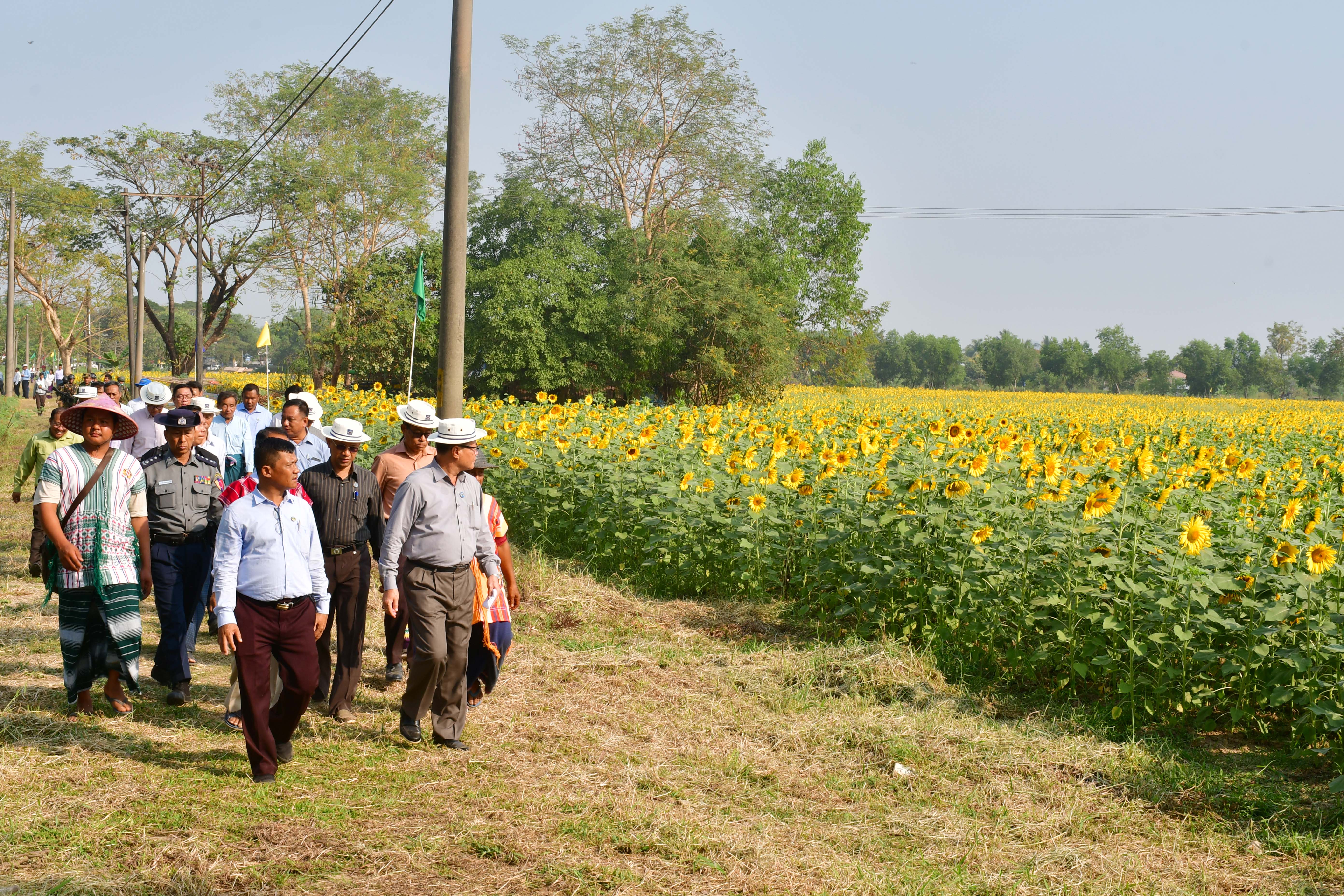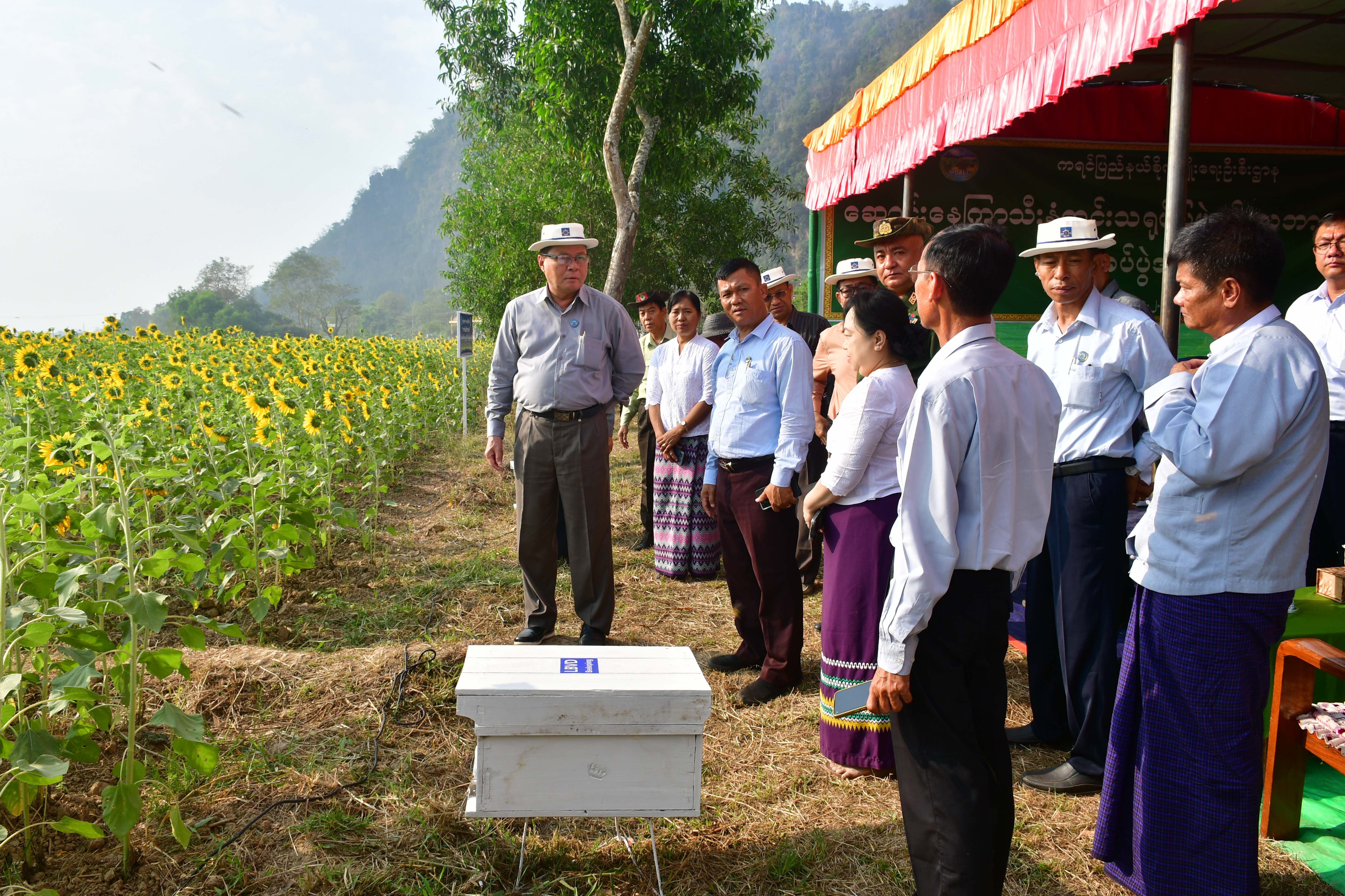 နေကြာစိုက်ခင်းအနီး မွေးမြူရေးနှင့်ကုသရေးဦးစီးဌာန၊ ပျားမွေးမြူမှုဖွံ့ဖြိုးရေးဌာနခွဲ၏ ဝတ်မှုံကူးပျားအုံးများ ထားရှိပြီး သီးနှံအထွက်တိုးရေးအတွက်ပျားဖြင့်ဝတ်မှုံကူးနေခြင်းကို ပြည်နယ်ဝန်ကြီးချုပ်နှင့်တာဝန်ရှိသူများက ကြည့်ရှု အားပေးခဲ့ကြပြီး တာဝန်ရှိသူများ၏ ရှင်းလင်းတင်ပြမှုများအပေါ် လိုအပ်သည်များပေါင်းစပ်ညှိနှိုင်းဖြည့်ဆည်းဆောင်ရွက် ပေးကာ ဆောင်းနေကြာအထွက်နှုန်းတိုးတက်ရေးစံပြကွက်အား လှည့်လည်ကြည့်ရှုအားပေးခဲ့ကြပါသည်။