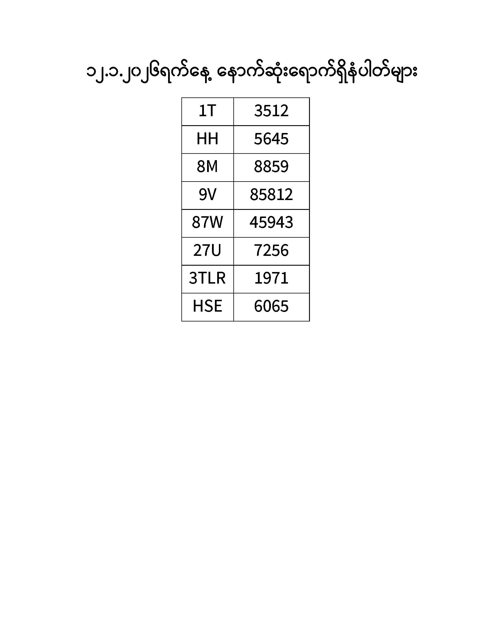 ၁၂.၁.၂၀၂၆ ရက်နေ့ထိ နောက်ဆုံးရောက်ရှိ နံပါတ်များ