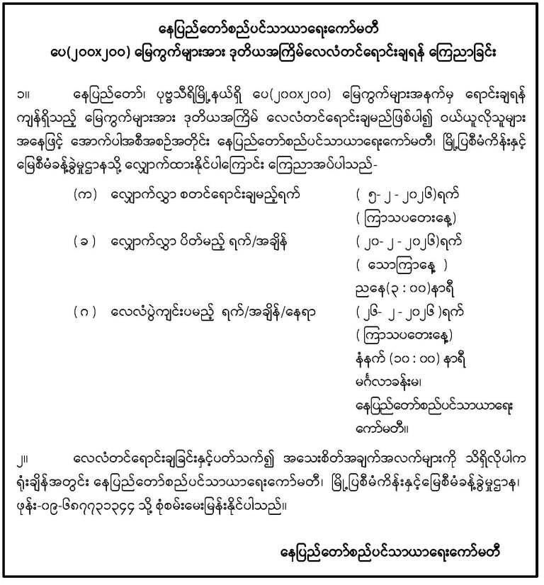 Downloadနေပြည်တော်စည်ပင်သာယာရေးကော်မတီ၊ မြို့ပြစီမံကိန်းနှင့်မြေစီမံခန့်ခွဲမှုဌာနမှ ကြော်ငြာခြင်း