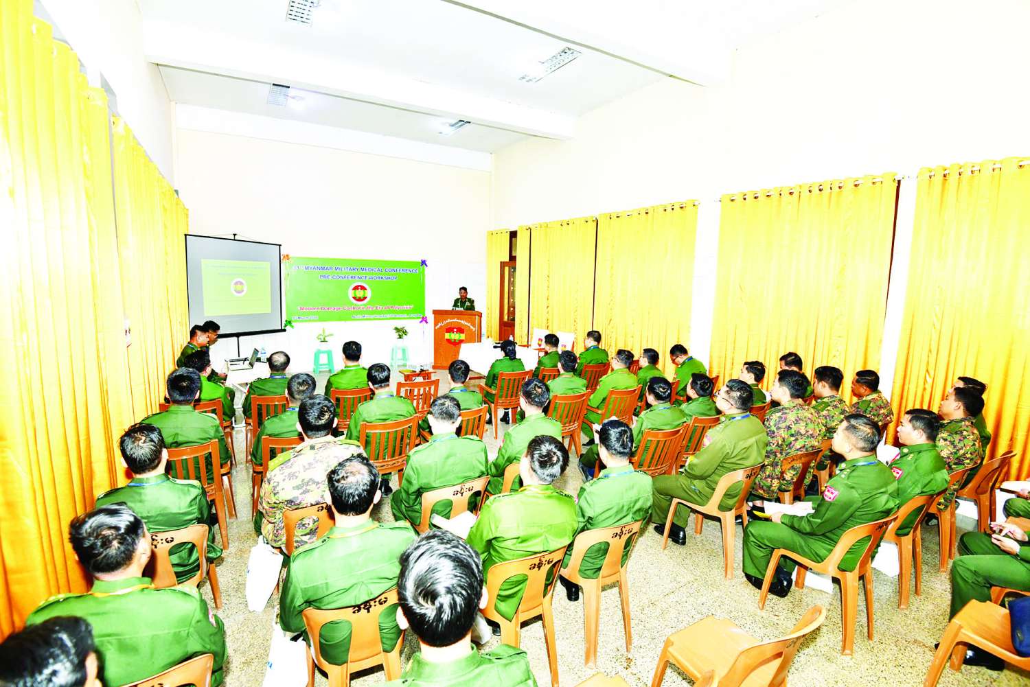 (၃၁) ကြိမ်မြောက် မြန်မာ့တပ်မတော်ဆေးပညာရပ်ဆိုင်ရာ နှီးနှောဖလှယ်ပွဲအကြို အလုပ်ရုံဆွေးနွေးပွဲ (Pre-Conference Workshop)ကို ယနေ့နံနက်ပိုင်းတွင် မေ့ဆေးပညာဌာနနှင့် ခွဲစိတ်ကုပညာဌာနတို့က ဦးဆောင်၍ အောင်ပန်းမြို့ရှိ နယ်မြေခံတပ်မတော်ဆေးရုံ (ခုတင်-၇၀၀) မေ့ဆေးပညာဌာန၌ ပြုလုပ်ရာ ကလောတပ်နယ်မှ ပါရဂူများ၊ ဆေးမှူးများ၊ သူနာပြုအရာရှိများနှင့် အခြားဆေးဘက်ဆိုင်ရာ ကျွမ်းကျင်သူများ စုစုပေါင်း ၃၄ ဦး တက်ရောက်ပါဝင်ဆွေးနွေးကြသည်။