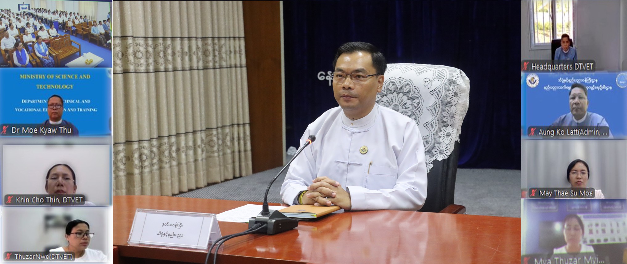 အမျိုးသားအဆင့် လျှပ်စစ်သုံးယာဉ်နှင့် ဆက်စပ်လုပ်ငန်းများ ဖွံ့ဖြိုးတိုးတက်ရေး ဦးဆောင်ကော်မတီ၏ ညွှန်ကြားချက်များအတိုင်း သိပ္ပံနှင့်နည်းပညာဝန်ကြီးဌာနသည် နိုင်ငံတော်တွင် လျှပ်စစ်သုံးယာဥ်(Electric Vehicle ၊ EV)ကဏ္ဍဖွံ့ဖြိုးရေးအတွက် ဆက်စပ်ဌာနများနှင့် ပူးပေါင်းကြိုးပမ်းဆောင်ရွက်လျက်ရှိရာ အစိုးရစက်မှုလက်မှုသိပ္ပံ (အင်းစိန်)၌ ယနေ့ နေ့လယ်ပိုင်း၌ Hybrid စနစ်ဖြင့် ကျင်းပသည့် EV ပြုပြင်ထိန်းသိမ်းမှု သင်တန်း (၁/၂၀၂၆) ဆင်းပွဲ အခမ်းအနားကို လျှပ်စစ်သုံးယာဉ်နှင့် ဆက်စပ်ပစ္စည်းများ သုတေသနဖွံ့ဖြိုးရေးနှင့် နည်းပညာပြန့်ပွားရေးလုပ်ငန်း ကော်မတီဥက္ကဋ္ဌ သိပ္ပံနှင့်နည်းပညာဝန်ကြီးဌာန ဒုတိယဝန်ကြီး ဒေါက်တာ အောင်ဇေယျသည် ဗွီဒီယိုကွန်ဖရင့်ဖြင့် တက်ရောက်သည်။