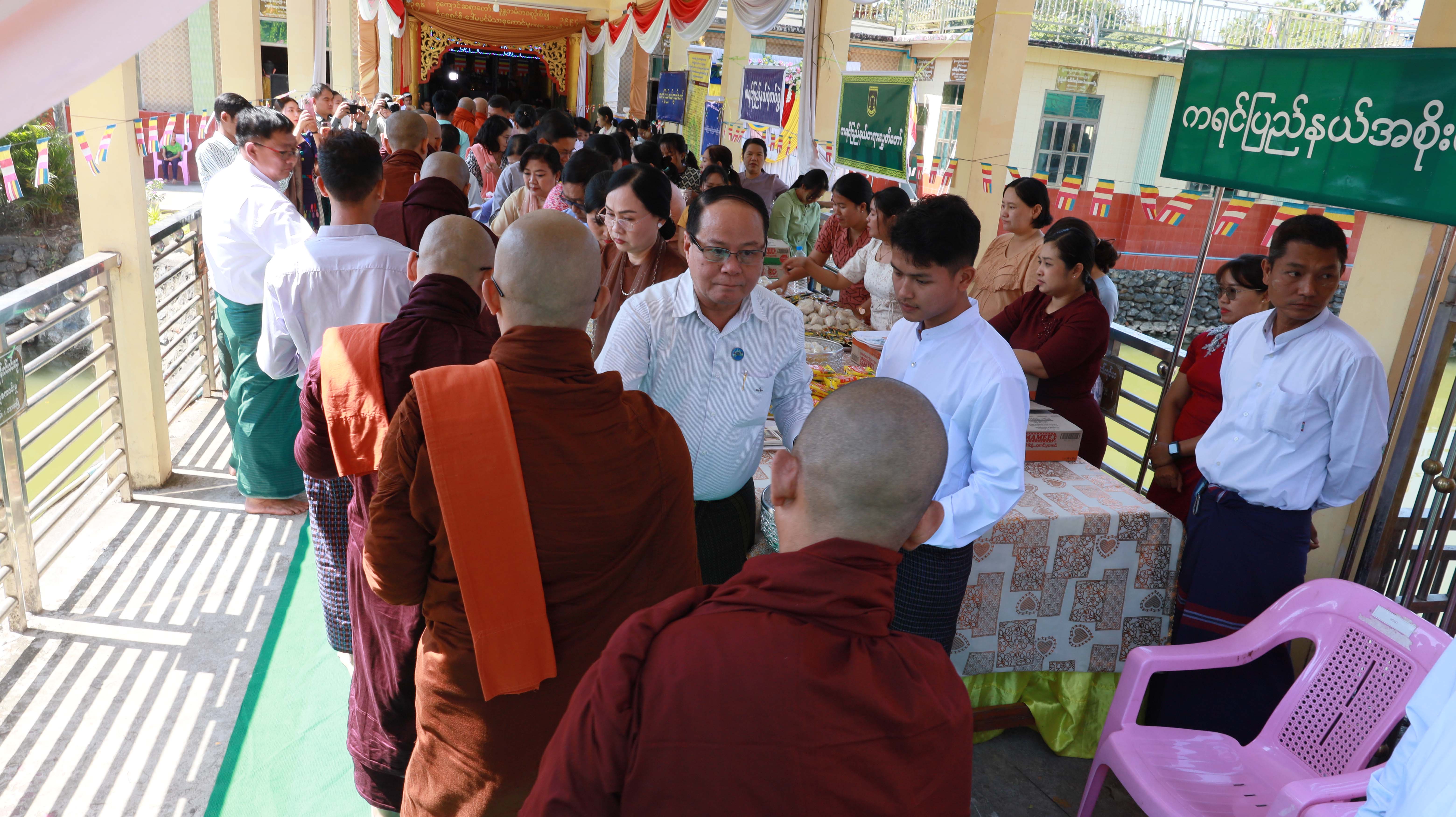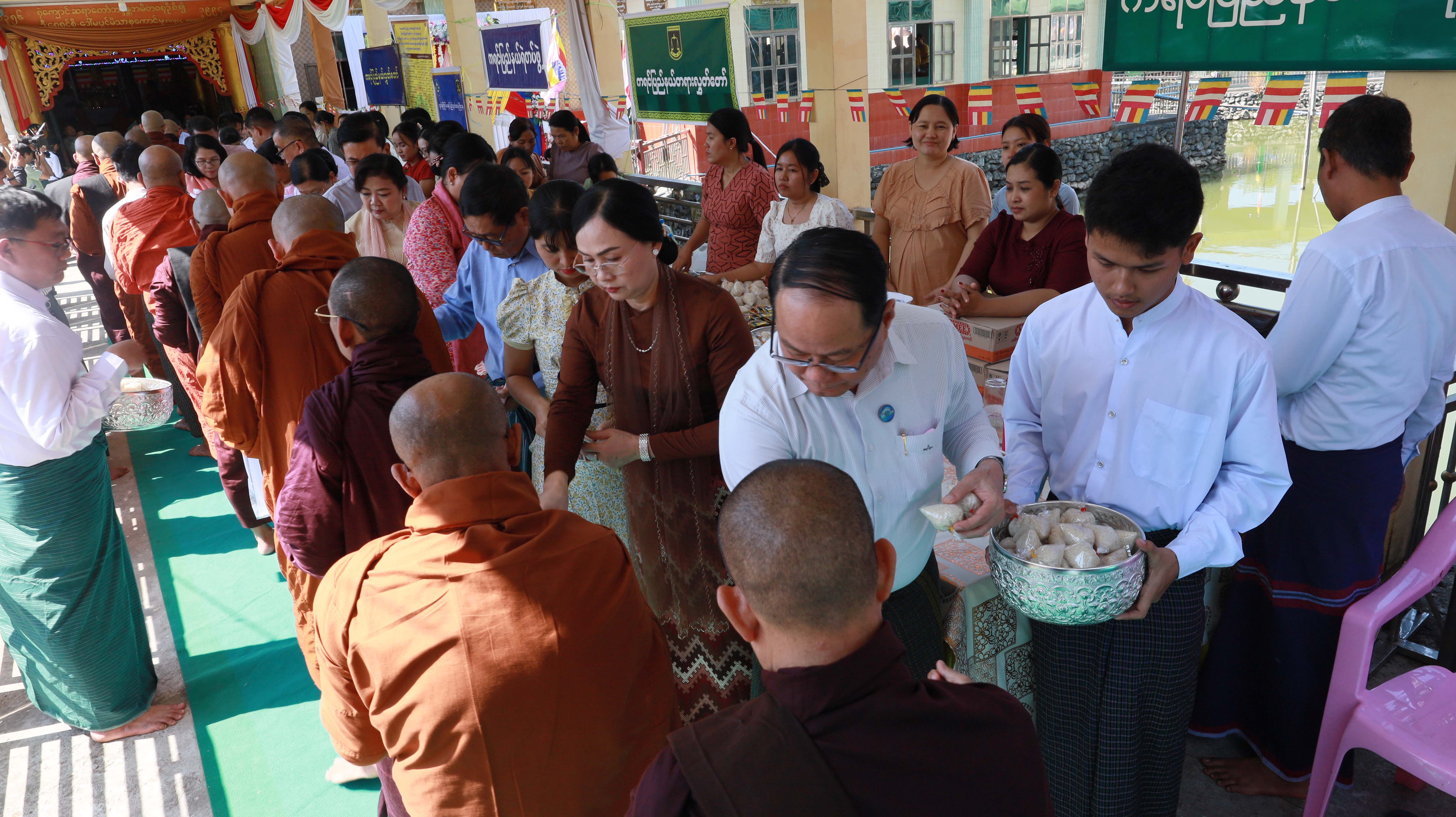 ဦးစွာ ပြည်နယ်ဝန်ကြီးချုပ်ဦးစောမြင့်ဦး၊ ပြည်နယ်အမျိုးသမီးရေးရာအဖွဲ့နာယက၊ ပြည်နယ်တရားလွှတ်တော် တရားသူကြီးချုပ်ဦးညွန့်လင်း၊ ပြည်နယ်အစိုးရအဖွဲ့ဝင်များ၊ ပြည်နယ်အမျိုးသမီးရေးရာအဖွဲ့နှင့်မိခင်နှင့်ကလေးစောင့် ရှောက်မှုကြီးကြပ်ရေးအဖွဲ့ဝင်များ၊ မြို့မိမြို့ဖများ၊ တပည့်ဒါယကာ၊ဒါယိကာမများနှင့် ဧည့်ပရိသတ်အပေါင်းတို့က အမိတာရာမရဲကျောင်းတိုက်ဆရာတော် ဂန္ထဝါစကပဏ္ဍိတ အဂ္ဂမဟာသဒ္ဓမ္မဇောတိကဓဇ ဘဒ္ဒန္တဂုဏလင်္ကာရထံမှ ငါးပါး သီလခံယူဆောက်တည်ကြပြီး လူဖွယ်ဝတ္ထုပစ္စည်းများနှင့် နဝကမ္မအလှူငွေများဆက်ကပ်လှူဒါန်းကြကာ လှူဒါန်းမှုအစုစု တို့အတွက် အနုမော ဒနာတရားနာကြား၍ ရေစက်သွန်းချအမျှပေးဝေးခဲ့ကြသည်။