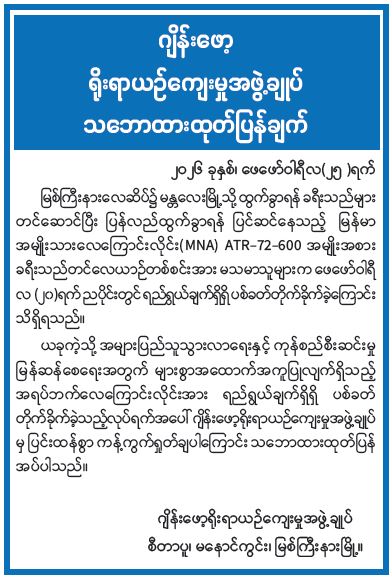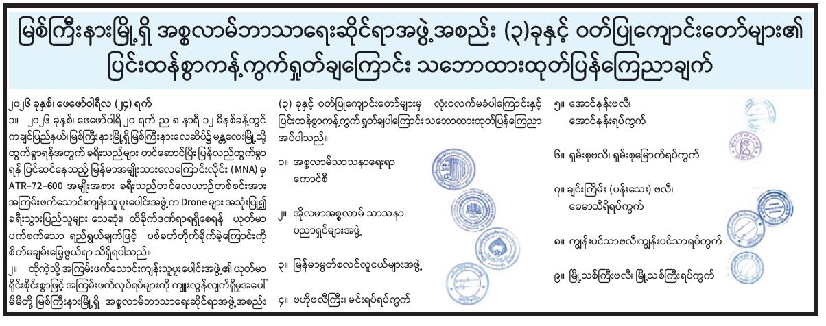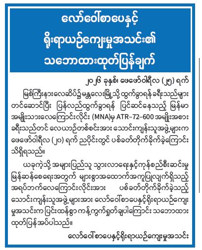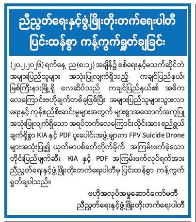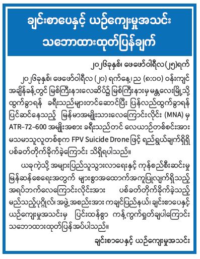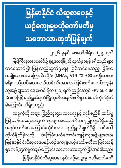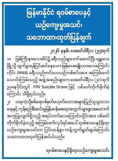 မြစ်ကြီးနားလေဆိပ်မှ ခရီးသည်တင်လေယာဉ်အား KIA အဖွဲ့နှင့် PDF အမည်ခံ အကြမ်းဖက်သောင်းကျန်းသူ ပူးပေါင်းအဖွဲ့များက ယုတ်မာပက်စက်စွာ FPV suicide drone များဖြင့် ပစ်ခတ်တိုက်ခိုက်ခဲ့မှုအပေါ် ပြင်းထန်စွာ ကန့်ကွက်ရှုတ်ချကြောင်း သဘောထားထုတ်ပြန်ချက်များ ထပ်မံထုတ်ပြန်