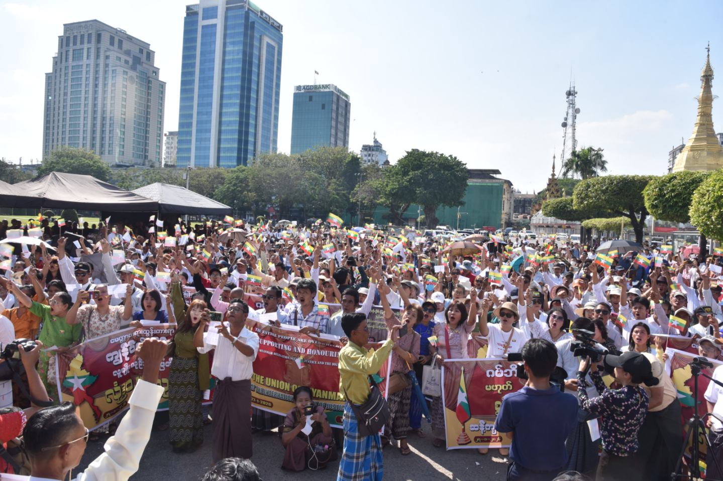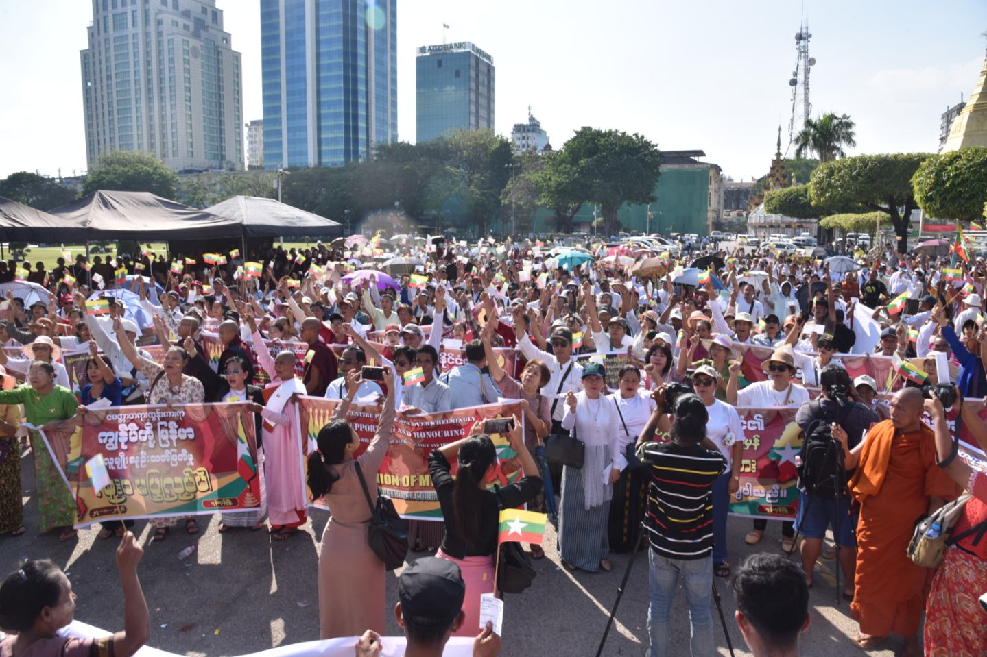 ပြည်ထောင်စုသမ္မတမြန်မာနိုင်ငံတော်၏ ဂုဏ်သိက္ခာနှင့် တရားမျှတသော အမှန်တရားအတွက် နယ်သာလန်နိုင်ငံ၊ သည်ဟိတ်ဂ်မြို့၊ အပြည်ပြည်ဆိုင်ရာတရားရုံး (ICJ) ၌ သွားရောက်ဖြေရှင်းနေသော မြန်မာကိုယ်စားလှယ်အဖွဲ့၏ လျှောက်လဲချေပချက်များအား ထောက်ခံဂုဏ်ပြုပွဲနှင့် ဂမ်ဘီယာနိုင်ငံ၏ မဟုတ်မမှန်စွပ်စွဲချက်များကို ကန့်ကွက်ရှုတ်ချသည့် အမျိုးသားရေးဆန္ဒထုတ်ဖော်ပွဲကို ယနေ့မွန်းလွဲပိုင်းတွင် ရန်ကုန်မြို့၊ မြို့တော်ခန်းမရှေ့၊ ယာဉ်ရပ်နားကွင်း၌ ပြုလုပ်ရာ မျိုးချစ်မြန်မာရဟန်းတော်များသမဂ္ဂမှ သံဃာတော်များ၊ သာသနာနွယ်ဝင် သီလရှင်များ၊ ပြည်သူများ၊ နိုင်ငံရေးပါတီများမှ ပါတီဝင်များ တက်ရောက်ကြသည်။