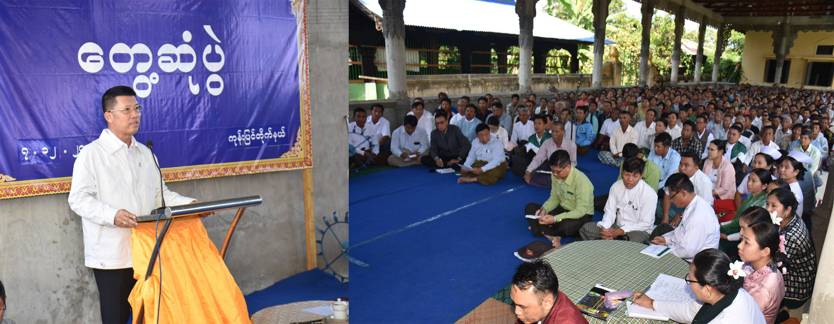 ဆက်လက်၍ တိုင်းဒေသကြီးဝန်ကြီးချုပ်နှင့်အဖွဲ့သည် ရေကြည်မြို့နယ်၊ ငါးသိုင်းချောင်းမြို့၊ မြို့သစ်ရပ်ကွက်၊ ရွှေရေးဆောင်ကျောင်းတိုက် ဆရာတော်အား ဖူးမြော်ကြည်ညိုခဲ့ပြီး သာသနာရေးဆိုင်ရာ ကိစ္စရပ်များနှင့် ဒေသဖွံ့ဖြိုးရေးဆိုင်ရာ ကိစ္စရပ်များအား တင်ပြလျှောက်ထားကာ လှူဖွယ်ပစ္စည်းများ ဆက်ကပ်လှူဒါန်းခဲ့ပြီးနောက် သာသနဇယကေတုသိမ်တော်ကြီးတွင် ဒေသခံပြည်သူများနှင့်တွေ့ဆုံ၍ တိုင်းဒေသကြီးဝန်ကြီးချုပ်က“ တိုင်းဒေသကြီးသည် လူ့စွမ်းအားအရင်းအမြစ်များ ပေါကြွယ်ဝပြီး အခြေခံပညာကျောင်းတက်ရောက်မှု၊ ကျောင်းဖွင့်လှစ်မှုအများဆုံးတိုင်းဒေသကြီးဖြစ်ပါကြောင်း၊ စိုက်ပျိုးရေးနှင့်မွေးမြူရေးတက္ကသိုလ်ကို မအူပင်မြို့တွင် ဖွင့်လှစ်ပြီးဖြစ်၍ တိုင်းဒေသကြီး၏ စိုက်ပျိုးမွေးမြူရေးကို အထောက်အကူပြုမည့် ပညာရှင်များမွေးထုတ်ပေးနိုင်တော့မည်ဖြစ်ပါကြောင်း၊ တိုင်းဒေသကြီးက ထွက်ရှိသည့် စပါးခွံများကိုလည်း စပါးခွံ လောင်စာသုံး Gasifier စနစ်ဖြင့် လျှပ်စစ်ဓာတ်အားထုတ်လုပ်နိုင်ရေးဆောင်ရွက်လျက်ရှိပါကြောင်းနှင့် မြန်အောင်ခရိုင်အတွင်းရှိ ကညင်ရေလှောင်တမံမှ (၁၀.၅) မဂ္ဂါဝပ် ရေအားလျှပ်စစ် ထုတ်လုပ်ရေး စီမံကိန်းအကောင်အထည် ဖော်ဆောင်ရွက်လျက်ရှိပါကြောင်း၊ တိုင်းဒေသကြီးဆီဖူလုံရေးအတွက် မြေပဲ၊ နှမ်း၊ နေကြာ၊ ပဲပုပ် စသည့်ဆီထွက်သီးနှံများကို တိုးချဲ့စိုက်ပျိုးလျက်ရှိပါကြောင်း၊ ပီလောပီနံ စိုက်ပျိုးရေးနှင့်ပတ်သက်၍ ကျုံပျော်ခရိုင်ကိုအခြေခံ၍ ပီလောပီနံ စိုက်ပျိုးရေးတွင် ဦးဆောင်တိုင်းဒေသကြီးဖြစ်ရန် ကြိုးပမ်းဆောင်ရွက်လျက်ရှိပါကြောင်း” ဆွေးနွေးပြောကြားပြီး ဒေသခံပြည်သူများ၏ တင်ပြချက်များအပေါ် သက်ဆိုင်ရာတာဝန်ရှိသူများနှင့် ပေါင်းစပ်ညှိနှိုင်းဆောင်ရွက်ပေးခဲ့သည်။