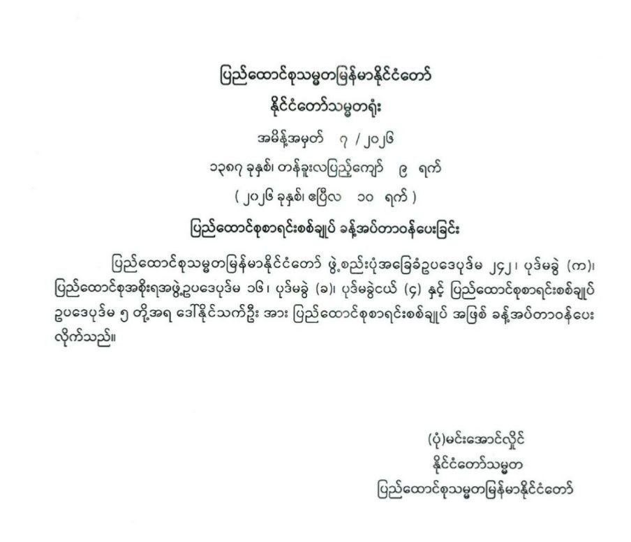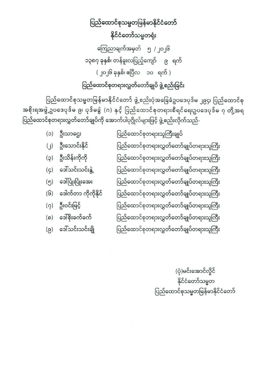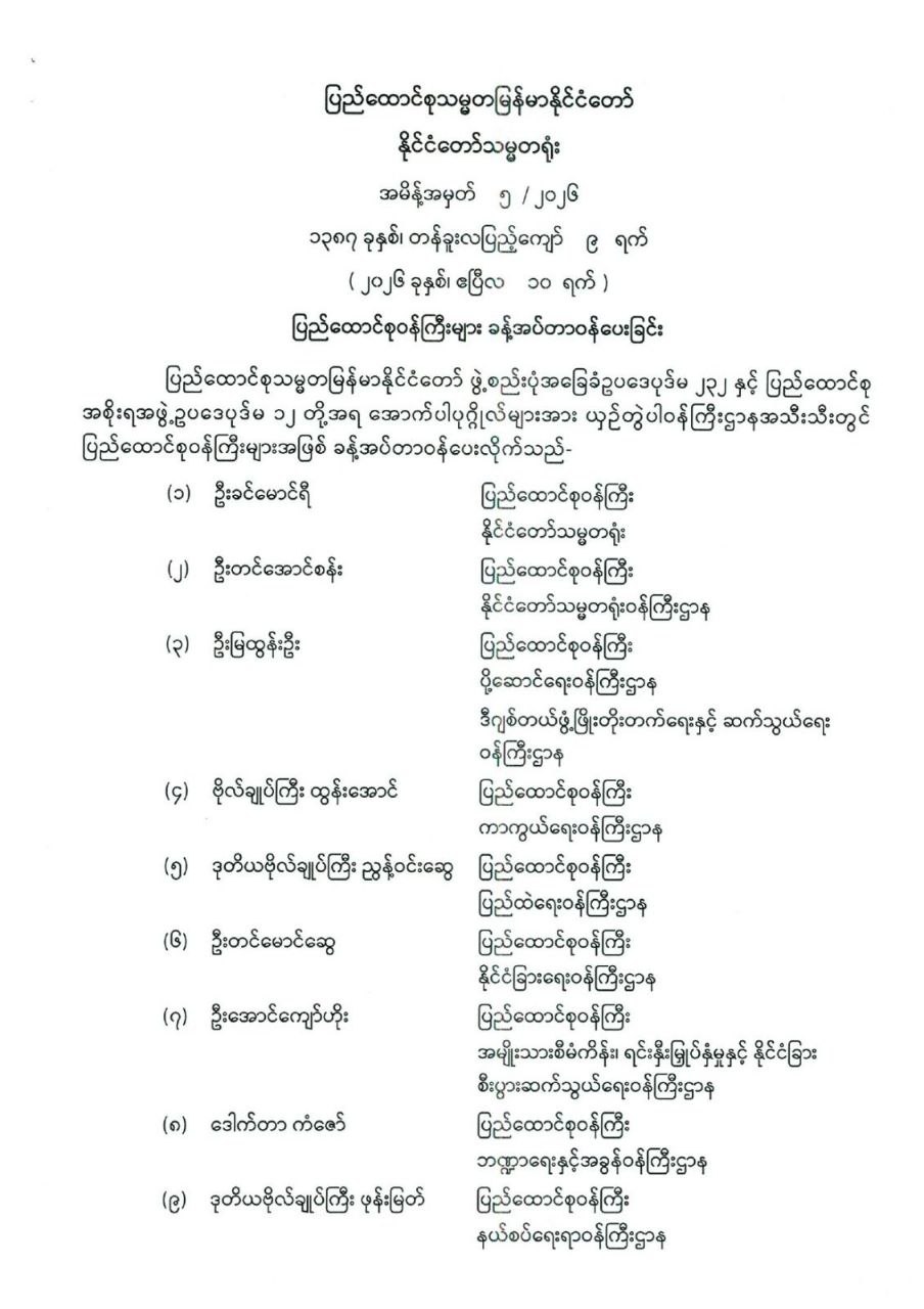 ပြည်ထောင်စုစာရင်းစစ်ချုပ် ခန့်အပ်တာဝန်ပေးခြင်း