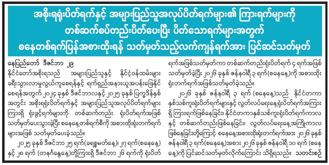 အစိုးရရုံးပိတ်ရက်နှင့် အများပြည်သူအလုပ်ပိတ်ရက်များ၏ ကြားရက်များကို တစ်ဆက်စပ်တည်း ပိတ်ပေးပြီး ပိတ်သောရက်များအတွက် စနေတစ်ရက်ပြန်အစားထိုးရန် သတ်မှတ်သည့် လက်ကျန်ရက်အား ပြင်ဆင်သတ်မှတ်