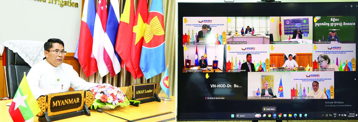 အာဆီယံအလှည့်ကျဥက္ကဋ္ဌ တာဝန်ယူဆောင်ရွက်နေသည့် ဖိလစ်ပိုင်နိုင်ငံက ဦးဆောင်၍ အွန်လိုင်းစနစ်ဖြင့် ယနေ့တွင် ကျင်းပသည့် အရှေ့အလယ်ပိုင်းဒေသ၏ နောက်ဆုံးအခြေအနေ များနှင့်ပတ်သက်သည့် အာဆီယံလယ်ယာစိုက်ပျိုးရေးနှင့် သစ်တောဆိုင်ရာဝန်ကြီးများ အထူးအစည်းအဝေးသို့ စိုက်ပျိုးရေး၊ မွေးမြူရေးနှင့် ဆည်မြောင်းဝန်ကြီးဌာန ပြည်ထောင်စုဝန်ကြီး ဦးမင်းနောင် ဦးဆောင်သည့် မြန်မာကိုယ်စားလှယ်အဖွဲ့ ပါဝင်တက်ရောက်သည်။