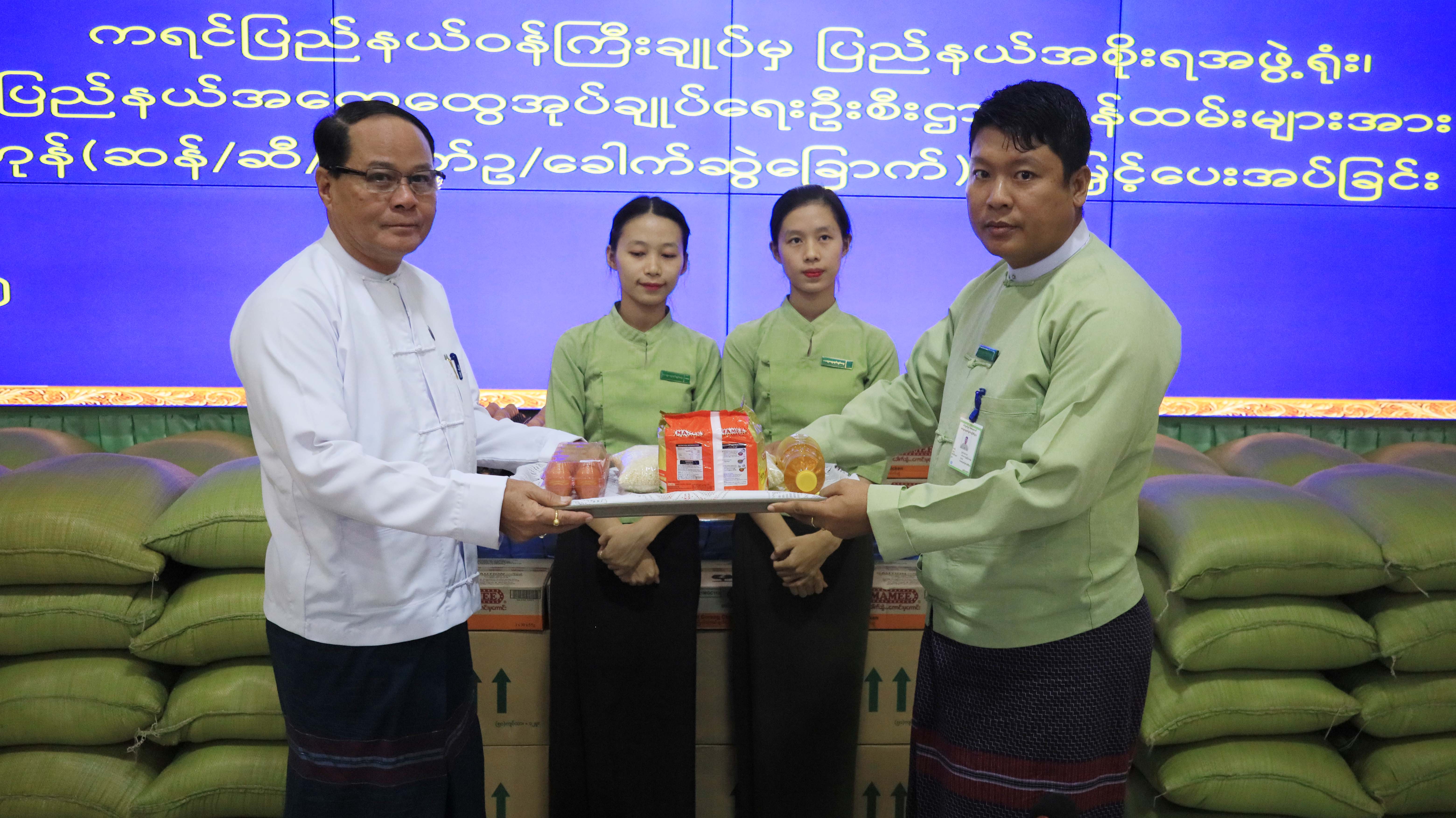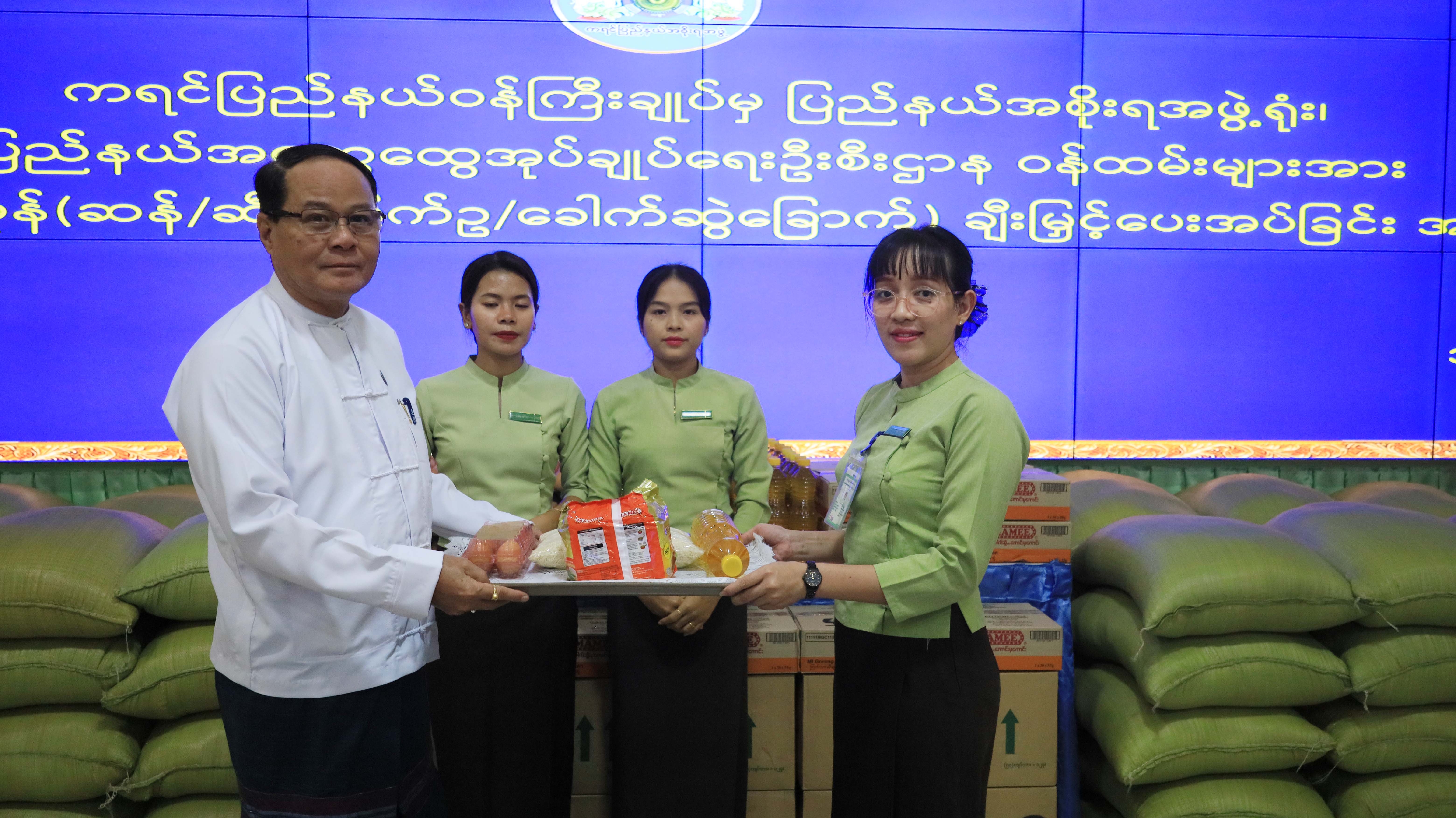 အလားတူ ကရင်ပြည်နယ်ဝန်ကြီးချုပ်က ပြည်နယ်အစိုးရအဖွဲ့ရုံး ပြည်နယ်အထွေထွေအုပ်ချုပ်ရေးဦးစီးဌာန ဝန်ထမ်းများအား စားသောက်ကုန်(ဆန်၊ ဆီ၊ ကြက်ဥ၊ ခေါက်ဆွဲခြောက်)ချီးမြှင့်ပေးအပ်သည့် အခမ်းအနားကို ဇန်နဝါရီ လ ၂၃ ရက်နေ့ မွန်းလွဲ ၃ နာရီက ပြည်နယ်အစိုးရအဖွဲ့ရုံး အစည်းအဝေးခန်းမ(၂)၌ ကျင်းပရာ ပြည်နယ်ဝန်ကြီးချုပ်က အမှာစကားပြောကြားပြီး ဝန်ထမ်းများအတွက် စုစုပေါင်းငွေကျပ် ၁၄၈၁၁၁၅၀(တစ်ရာလေးဆယ်ရှစ်သိန်းတစ်သောင်း တစ်ထောင်တစ်ရာ့ငါးဆယ်ကျပ်) တန်ဖိုးရှိ ဆန်၊ ဆီ၊ ကြက်ဥ ခေါက်ဆွဲခြောက်များကို ချီးမြှင့်ပေးအပ်ကာ ဝန်ထမ်းများ ကိုယ်စား ညွှန်ကြားရေးမှူးတစ်ဦးက ကျေးဇူးတင်စကားပြန်လည်ပြောကြားခဲ့ပါသည်။