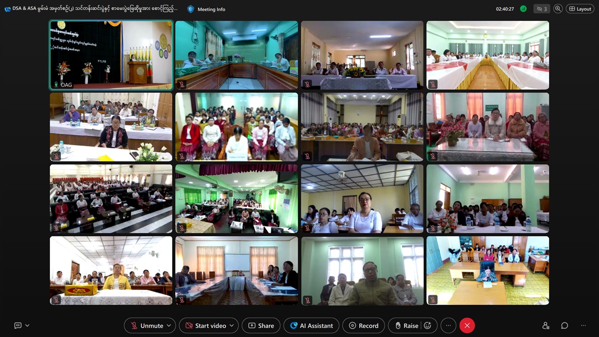 ပြည်ထောင်စုစာရင်းစစ်ချုပ်ရုံး၊ အဆင့်မြင့်စာရင်းကိုင်နှင့် စာရင်းစစ်သင်တန်းကျောင်း နေပြည်တော်နှင့် တိုင်းဒေသကြီး/ပြည်နယ်စာရင်းစစ်ချုပ်ရုံးများတွင် ဖွင့်လှစ်သည့် ဒု-စာရင်းစစ်မှူးနှင့် လက်ထောက်စာရင်းစစ်မှူးများ လုပ်ငန်းခွင်ကျွမ်းကျင်မှုမွမ်းမံသင်တန်း အမှတ်စဉ် (၂) သင်တန်းဆင်းပွဲအခမ်းအနားကို ၂၀၂၅ ခုနှစ်၊ ဒီဇင်ဘာလ ၄ ရက်နေ့ နံနက် ၁၀: ၀၀ နာရီတွင် နေပြည်တော်ရှိ ပြည်ထောင်စုစာရင်းစစ်ချုပ်ရုံး၊ နဝရတ်ခန်းမ၌ Hybrid စနစ်ဖြင့် ကျင်းပပြုလုပ်ခဲ့သည်။
