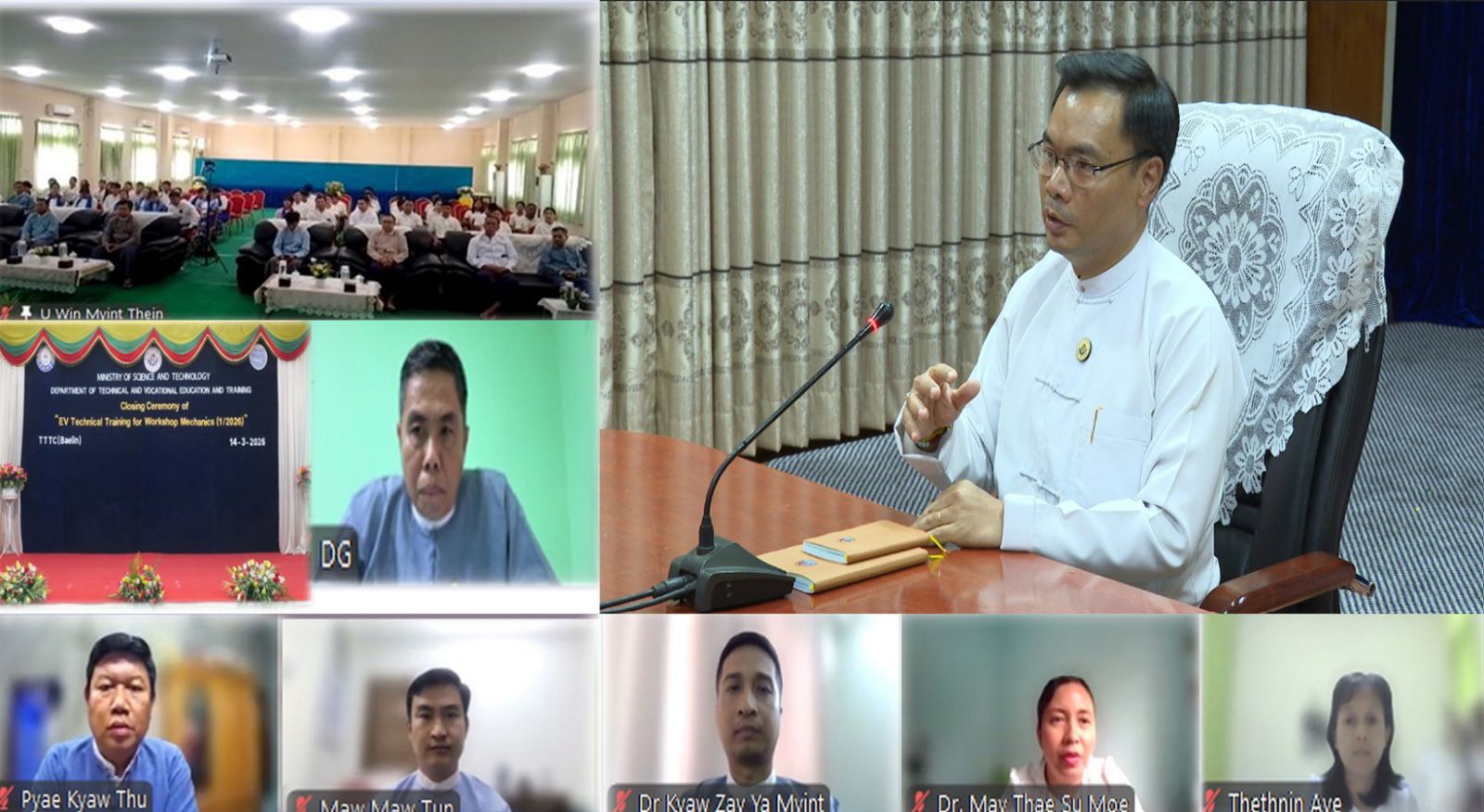 အမျိုးသားအဆင့် လျှပ်စစ်သုံးယာဉ်နှင့် ဆက်စပ်လုပ်ငန်းများ ဖွံ့ဖြိုးတိုးတက်ရေး ဦးဆောင်ကော်မတီ၏ ညွှန်ကြားချက်များအတိုင်း လျှပ်စစ်သုံးယာဉ်နှင့် ဆက်စပ်ပစ္စည်းများ သုတေသနဖွံ့ဖြိုးရေးနှင့် နည်းပညာပြန့်ပွားရေး လုပ်ငန်းကော်မတီသည် လုပ်ငန်းတာဝန်များကို ကြိုးပမ်းထမ်းဆောင်လျက်ရှိရာ နည်းပညာ၊ သက်မွေးပညာနှင့် လေ့ကျင့်ရေး ဆရာအတတ်သင်ကောလိပ် (ဘယ်လင်း)၌ ယနေ့ နေ့လယ်ပိုင်းတွင် Hybrid စနစ်ဖြင့် ကျင်းပသည့် EV Mechanics (၁/၂၀၂၆)သင်တန်းဆင်းပွဲအခမ်းအနားသို့ လုပ်ငန်းကော်မတီဥက္ကဋ္ဌ သိပ္ပံနှင့်နည်းပညာဝန်ကြီးဌာန ဒုတိယ ဝန်ကြီး ဒေါက်တာ အောင်ဇေယျသည် နည်းပညာ၊ သက်မွေးပညာနှင့် လေ့ကျင့်ရေးဦးစီးဌာန ညွှန်ကြားရေးမှူးချုပ်၊ ဒုတိယညွှန်ကြားရေးမှူးချုပ်များ၊ တာဝန်ရှိသူများနှင့်အတူ နေပြည်တော်မှ ဗွီဒီယိုကွန်ဖရင့်ဖြင့် တက်ရောက်သည်။