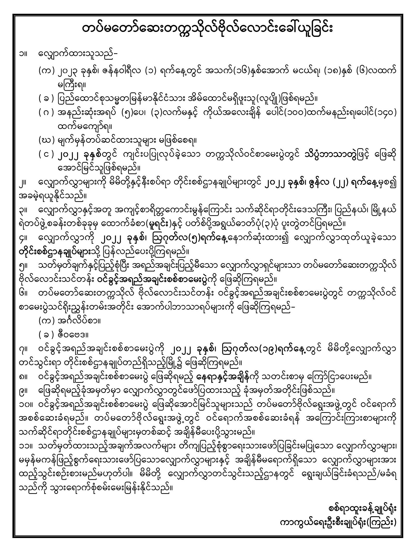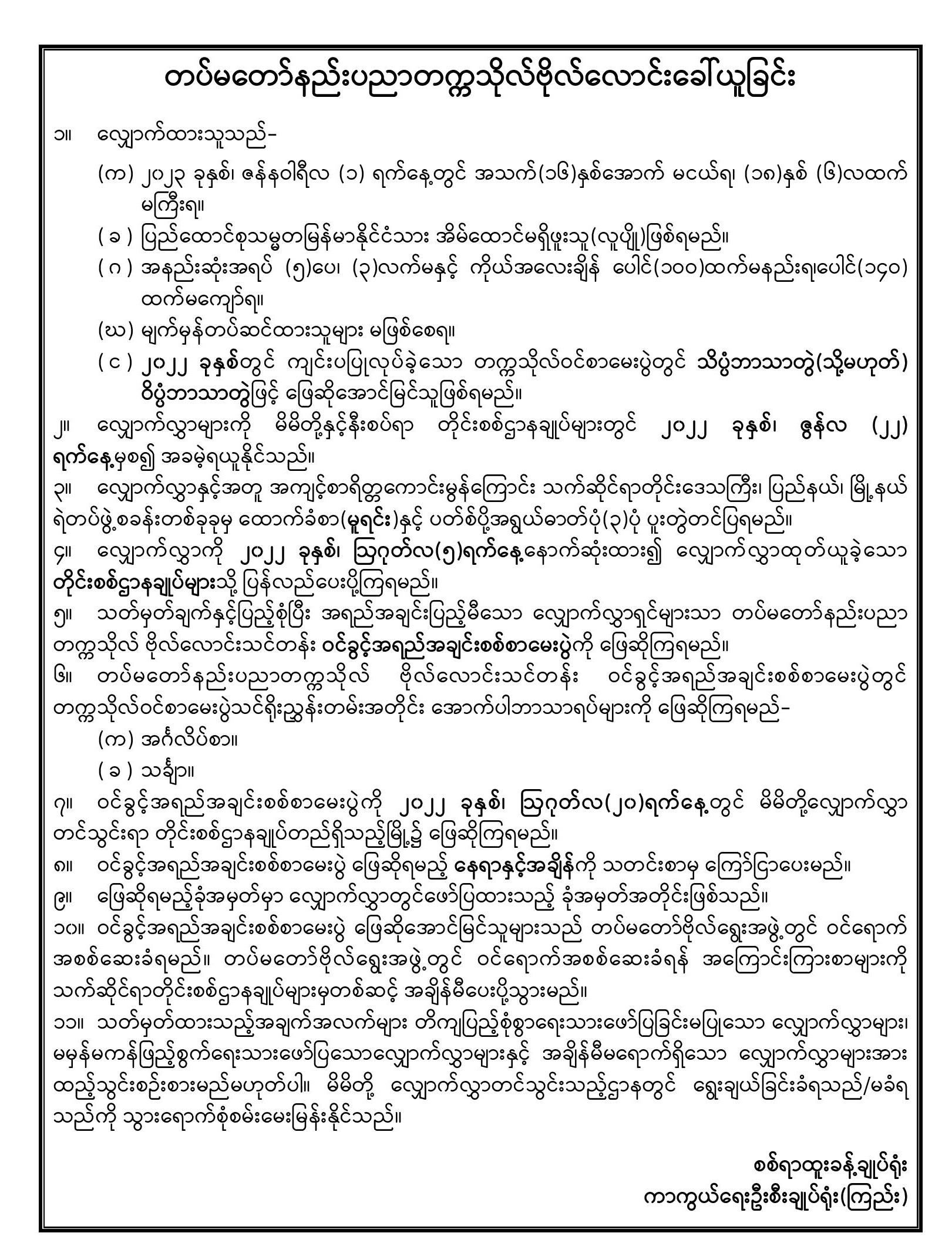 ဗိုလ်လောင်းဝင်ခွင့်အရည်အချင်းစစ်စာမေးပွဲစစ်ဆေးမည့် နေ့ရက်၊ နေရာနှင့်အချိန်တို့အား အသိပေးခြင်း