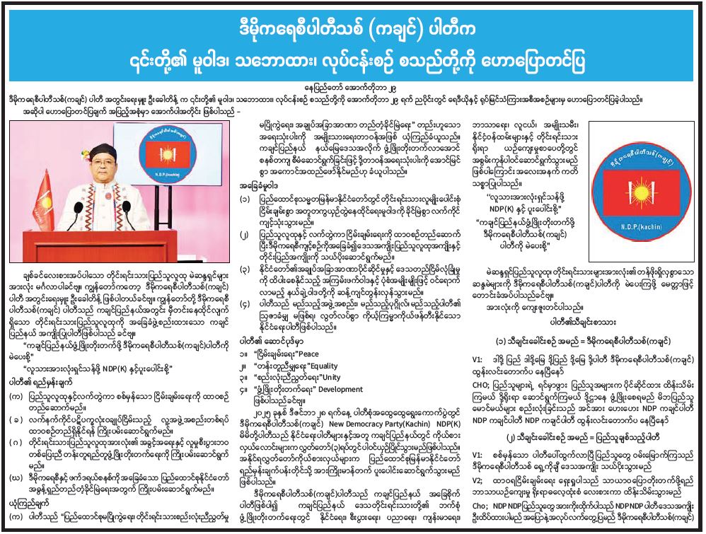 ဒီမိုကရေစီပါတီသစ် (ကချင်) ပါတီက၎င်းတို၏ မူဝါဒ၊ သဘောထား၊ လုပ်ငန်းစဉ် စသည်တိုကို ဟောပြောတင်ပြ