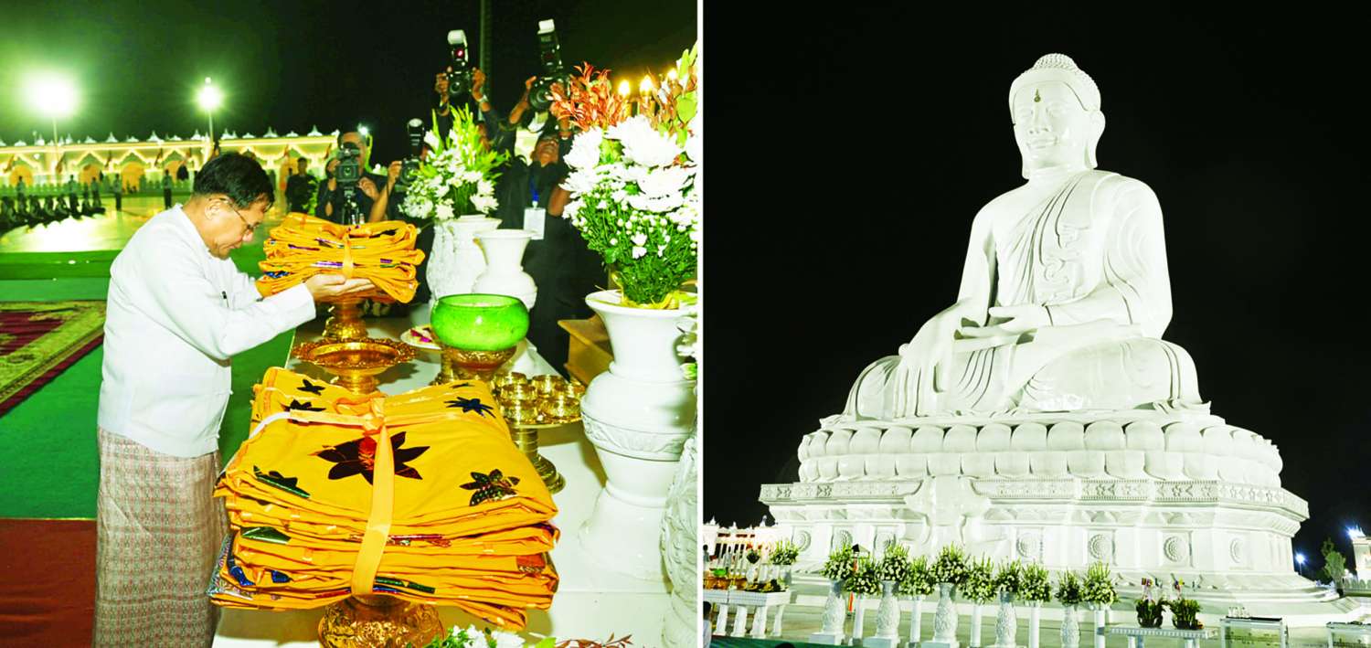 မာရဝိဇယဗုဒ္ဓရုပ်ပွားတော်မြတ်ကြီးအား ၂၀၂၅ ခုနှစ် တန်ဆောင်တိုင်ပွဲတော် မသိုးရွှေကြာသင်္ကန်းဆက်ကပ်လှူဒါန်းခြင်းမဟာမင်္ဂလာအခမ်းအနားကို ယနေ့နံနက် မင်္ဂလာအချိန်တွင် ကျင်းပပြုလုပ်ရာ ပြည်ထောင်စုသမ္မတမြန်မာနိုင်ငံတော်ယာယီသမ္မတ နိုင်ငံတော်လုံခြုံရေးနှင့်အေးချမ်းသာယာရေးကော်မရှင်ဥက္ကဋ္ဌ ဗိုလ်ချုပ်မှူးကြီး မင်းအောင်လှိုင် တက်ရောက်၍ မသိုးရွှေကြာသင်္ကန်း ဆက်ကပ်လှူဒါန်းသည်။