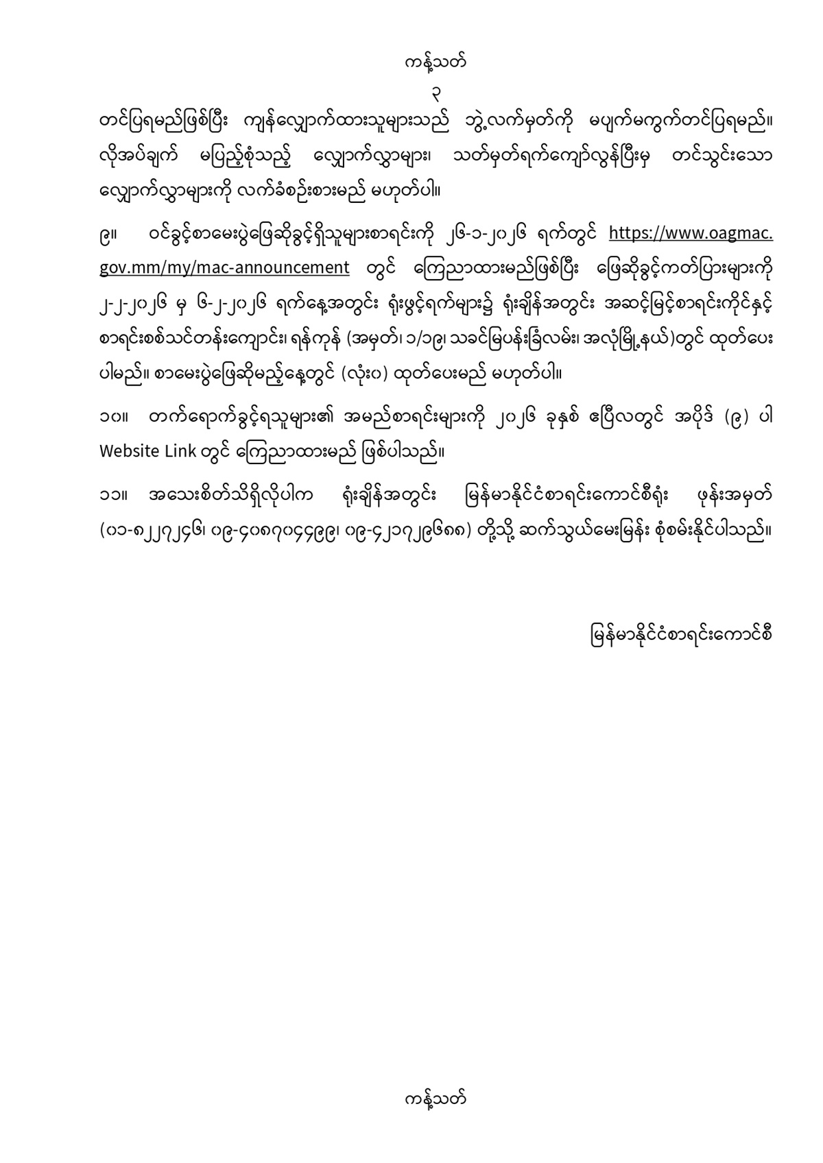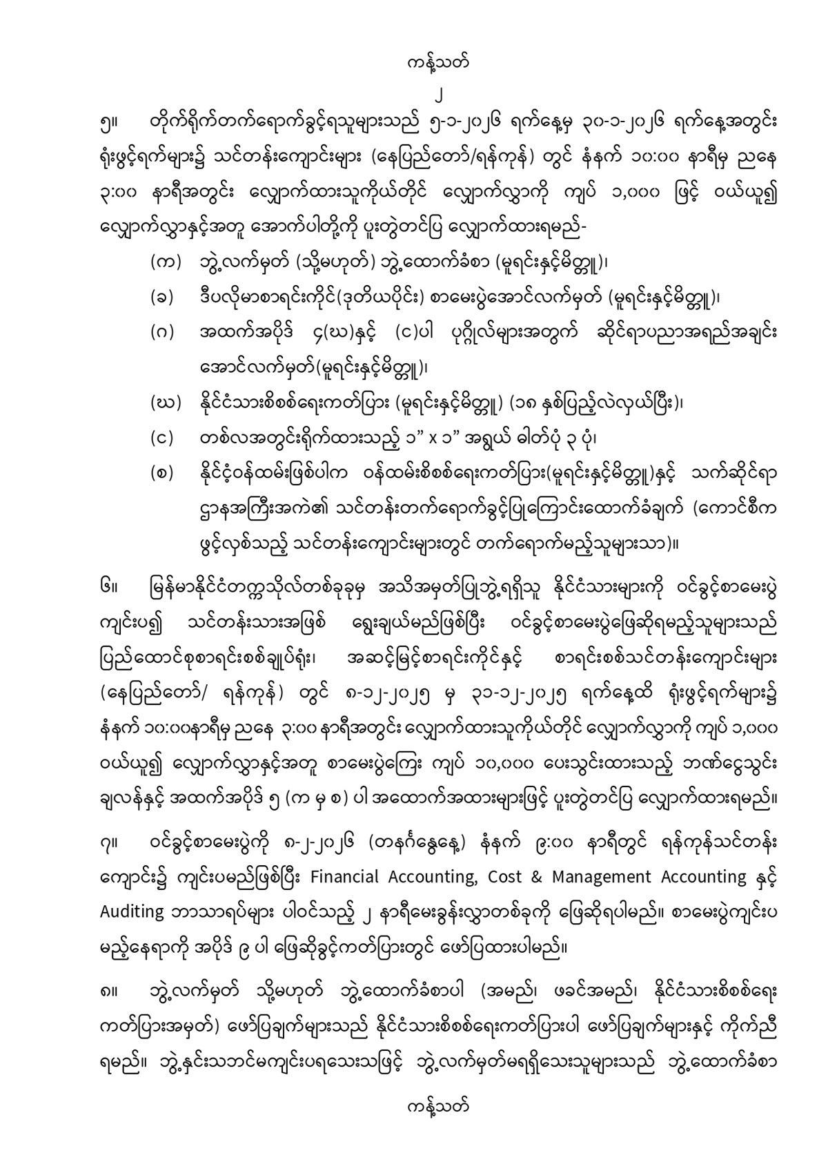 လက်မှတ်ရပြည်သူ့စာရင်းကိုင် (ပထမပိုင်း) သင်တန်းအမှတ်စဉ် (၅၀) သင်တန်းသားလျှောက်လွှာခေါ်ယူခြင်း