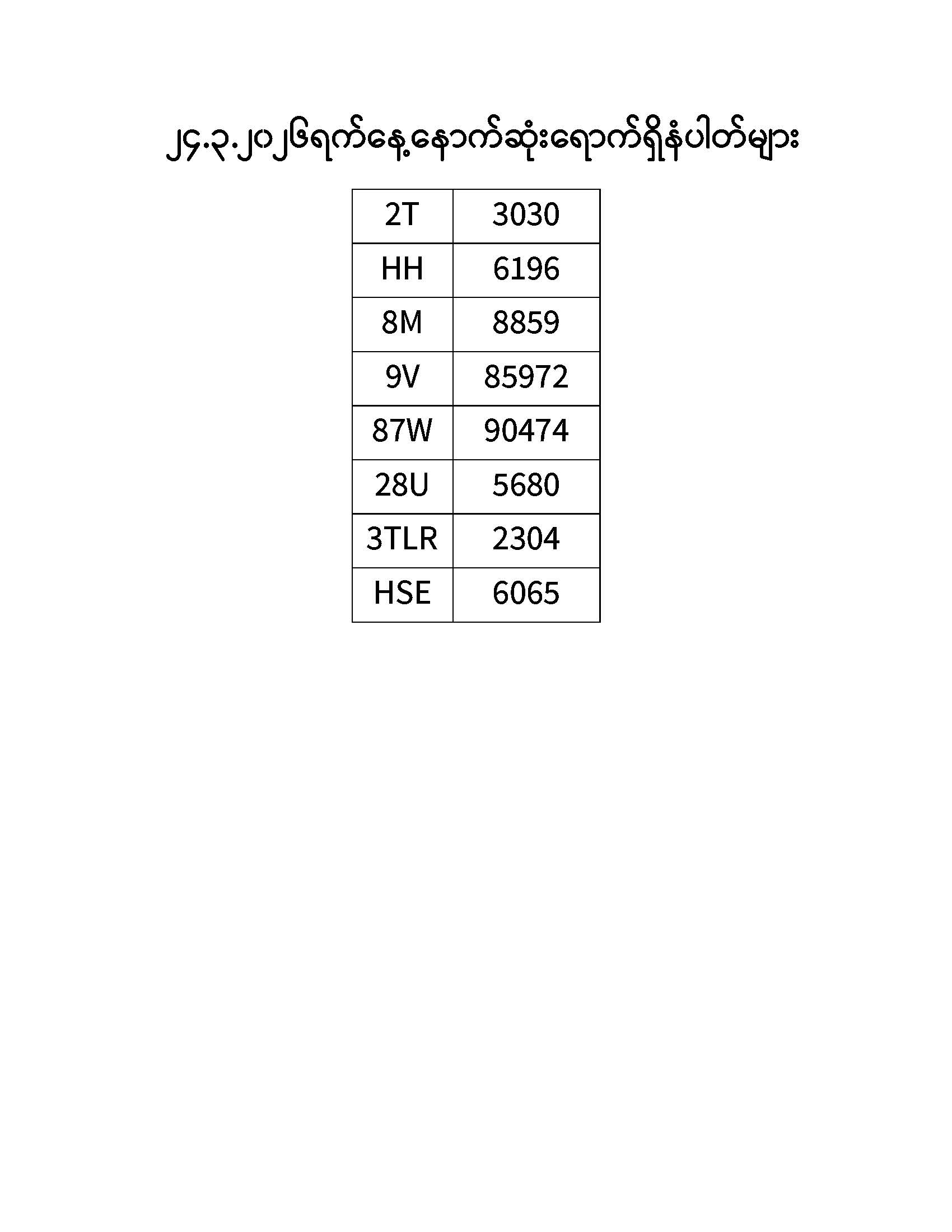 ၂၄.၃.၂၀၂၆ ရက်နေ့ထိ နောက်ဆုံးရောက်ရှိ နံပါတ်များ