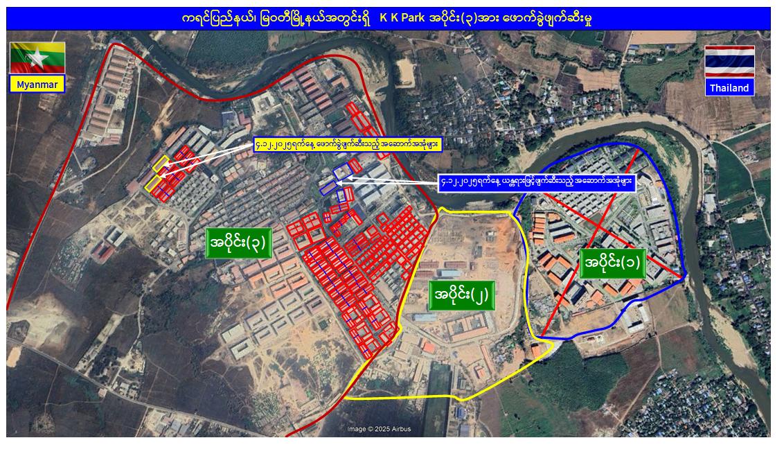 မြန်မာနိုင်ငံတော်အစိုးရအနေဖြင့် အွန်လိုင်းလိမ်လည်မှုများနှင့် အွန်လိုင်းလောင်းကစားမှုများ အများဆုံးအခြေချလုပ်ကိုင်လျက်ရှိကြသည့် ရွှေကုက္ကိုလ်နယ်မြေနှင့် မြဝတီ-မဲထော်သလေး (KK Park) နယ်မြေများ၌ လုံခြုံရေးတပ်ဖွဲ့ဝင်များ၊ အုပ်ချုပ်ရေးအဖွဲ့အစည်းများနှင့် ဒေသတွင်းတာဝန်ရှိသူများအပါအဝင် အဖွဲ့စုံပါဝင်သည့် ပူးပေါင်းအဖွဲ့ဖြင့် တရားမဝင်အဆောက်အအုံများအတွင်း ဝင်ရောက်ရှင်းလင်းခြင်း၊ အွန်လိုင်းလိမ်လည် လောင်းကစားမှုလုပ်ငန်းစဉ်များတွင် အသုံးပြုခဲ့သည့် သိမ်းဆည်းရမိပစ္စည်းများနှင့် တရားမဝင် အဆောက်အအုံများအား စနစ်တကျဖြိုချဖျက်ဆီးခြင်းနှင့် ချိပ်ပိတ်သိမ်းဆည်းခြင်းများ ဆောင်ရွက်လျက်ရှိရာ ယနေ့အထိ KK Park နယ်မြေအတွင်းရှိ တရားမဝင်အဆောက်အအုံ ၂၉၇ လုံးကို စနစ်တကျဖြိုချဖျက်ဆီးခဲ့ပြီးဖြစ်ကြောင်း သိရှိရသည်။