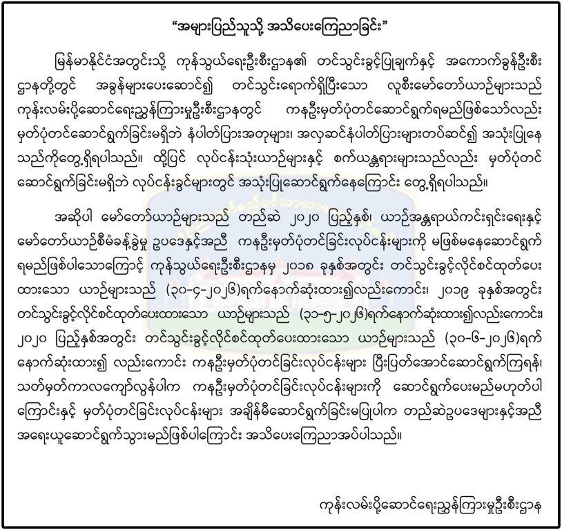 နေပြည်တော်စည်ပင်သာယာရေးကော်မတီမှ အများပြည်သူသို့အသိပေးကြော်ငြာခြင်း