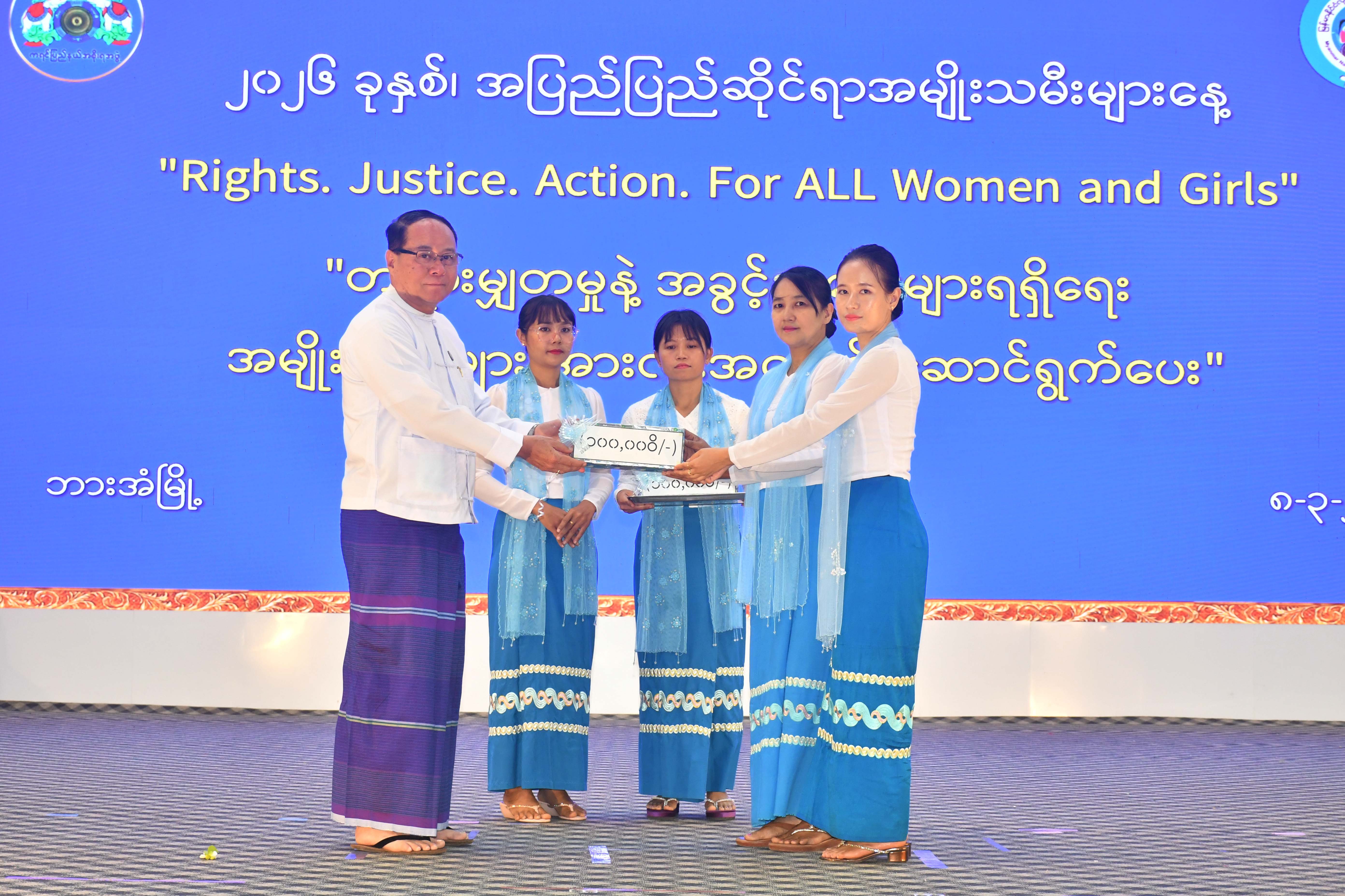 ထို့နောက် ပြည်နယ်ဝန်ကြီးချုပ်၊ ပြည်နယ်အမျိုးသမီးရေးရာအဖွဲ့နှင့် မိခင်နှင့်ကလေးစောင့်ရှောက်မှုကြီးကြပ်ရေး အဖွဲ့နာယက၊ ပြည်နယ်တရားလွှတ်တော်တရားသူကြီးချုပ်၊ ပြည်နယ်ဝန်ကြီးများ၊ အမျိုးသမီးများအရေးဆောင်ရွက်နေ သည့် အသင်းအဖွဲ့များနှင့်တက်ရောက်လာကြသူများက ကုလသမဂ္ဂအထွေထွေအတွင်းရေးမှူးချုပ်မှပေးပို့သော သဝဏ် လွှာ Video Clip နှင့် အပြည်ပြည်ဆိုင်ရာအမျိုးသမီးများနေ့အထိမ်းအမှတ် မြန်မာနိုင်ငံအမျိုးသမီးများဖွံ့ဖြိုးတိုးတက်ရေး ဆိုင်ရာဆောင်ရွက်ချက် Video Clip တို့ကို ကြည့်ရှုခဲ့ကြပြီး မူလတန်ကြိုကျောင်းများမှ ရင်သွေးငယ်လေးများက ကပြဖျော် ဖြေကြရာ ပြည်နယ်ဝန်ကြီးချုပ်၊ ပြည်နယ်အမျိုးသမီးရေးရာအဖွဲ့နှင့် မိခင်နှင့်ကလေးစောင့်ရှောက်မှုကြီးကြပ်ရေးအဖွဲ့ နာယက တို့က ဂုဏ်ပြုဆုငွေများပေးအပ်ချီးမြှင့်ကြသည်။