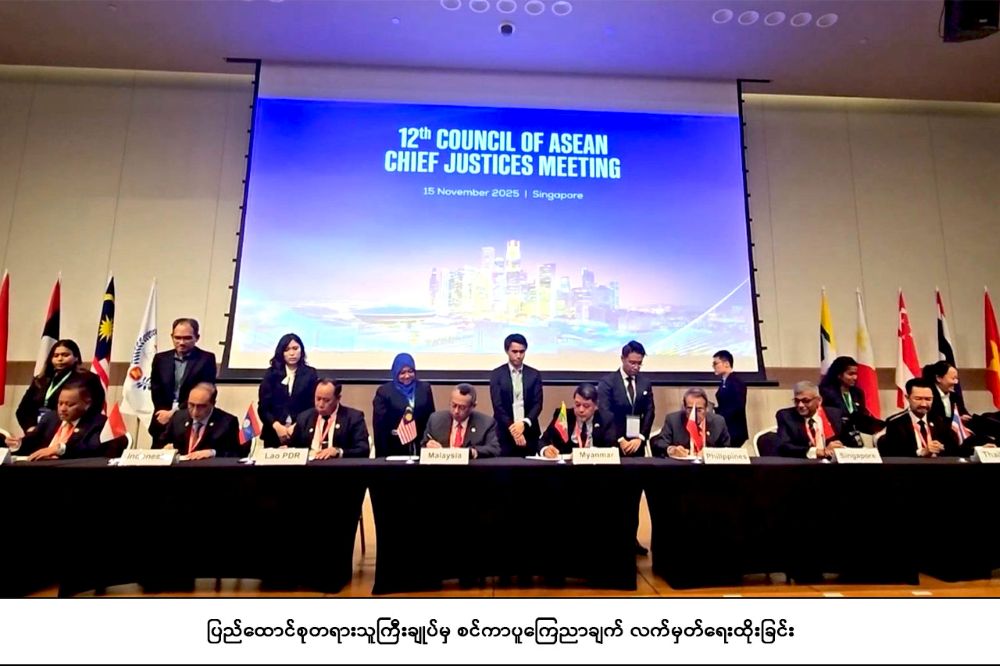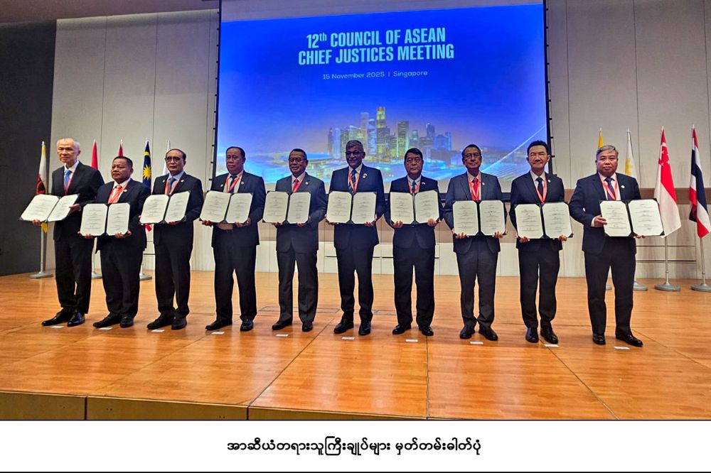 The Myanmar delegation, led by the Union Chief Justice, the Hon. U Tha Htay, attended the 12th Meeting of the Council of ASEAN Chief Justices at the Supreme Court of Singapore on November 15, 2025. At the opening session, the Union Chief Justice, the Hon. U Tha Htay, delivered a speech alongside other ASEAN Chief Justices, heads of delegation, and the ASEAN Deputy Secretary-General. Then CACJ Working Groups on the ASEAN Judiciaries Portal, Civil Proceedings, Case Management and Court Technology, Judicial Training and Education, Cross-border Disputes Involving Children, Conduct of Video Conferencing Hearings, ASEAN + Meetings and the Climate Justice presented their reports regarding the activities carried out, the achievements gained and the working plan to be continued and obtain formal approval. During the meeting, the Union Chief Justice, The Hon. U Tha Htay, discussed matters relating to the Myanmar judiciary.
