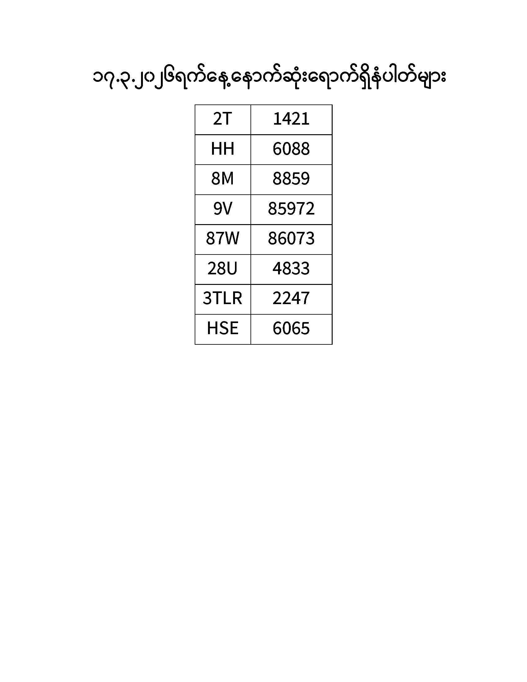 ၁၇.၃.၂၀၂၆ ရက်နေ့ထိ နောက်ဆုံးရောက်ရှိ နံပါတ်များ